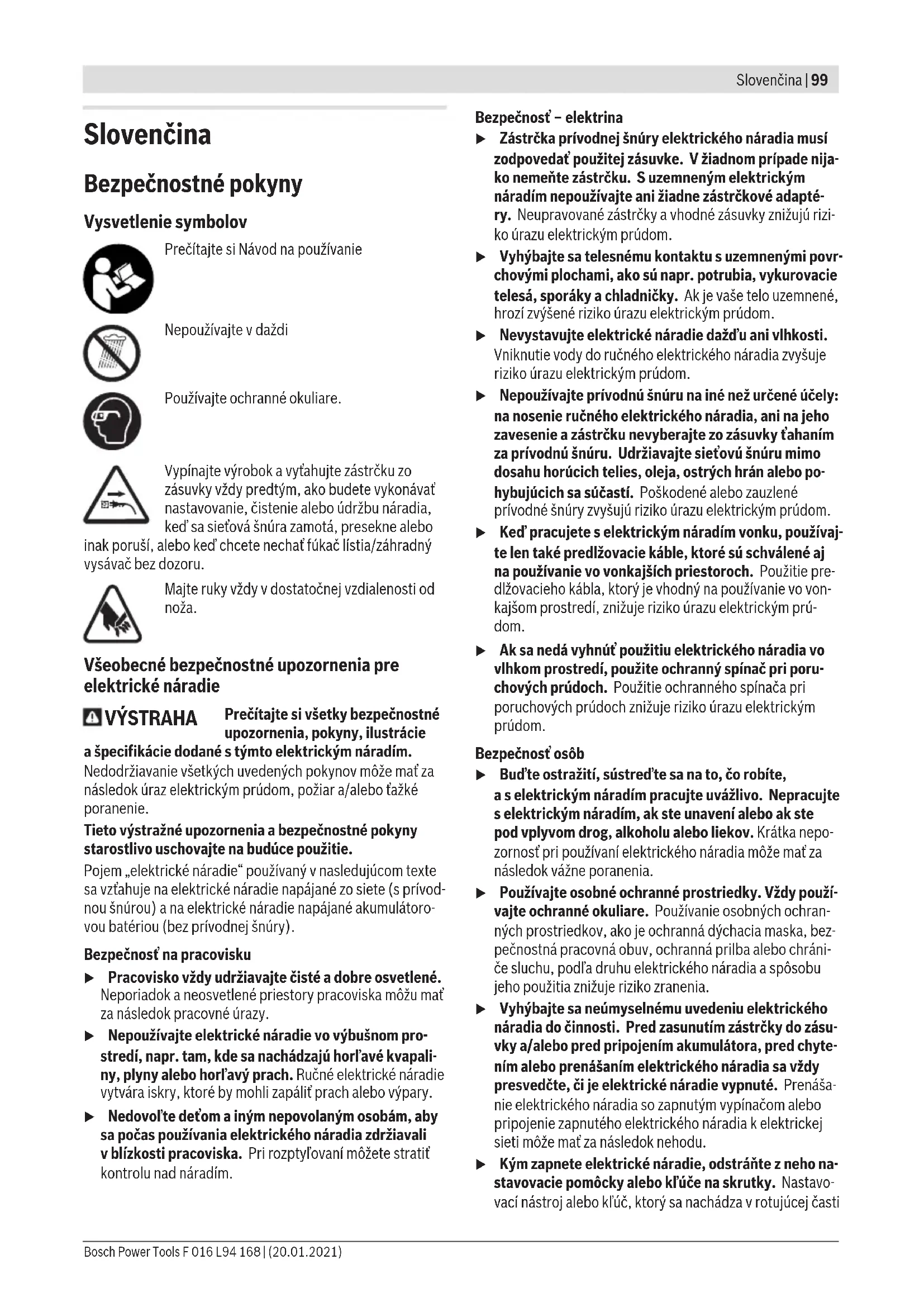 Obsluha u Dbejte na správné síťové napětí! Napětí zdroje proudu musí souhlasit s údaji na typovém štítku stroje. Zapnutí/vypnutí (viz obrázky C a D) Pro zapnutí stiskněte nejprve blokování zapnutí (3) a podržte jej stisknuté. Poté stiskněte spínač (2) apodržte ho stisknutý. Pro vypnutí uvolněte blokování zapnutí (3) a poté spínač (2). Řezací funkce Ačkoli rozevření zubů dovoluje střihnutí větví až do Ø20mm, je špička střihací lišty dimenzována pro střihy až do Ø25mm. Práce s nůžkami na živý plot (viz obrázek E) Pohybujte nůžkami na živý plot na linii střihu rovnoměrně vpřed. Oboustranná stříhací lišta umožňuje střih v obou směrech nebo kývavými pohyby z jedné na druhou stranu. Nejprve stříhejte boky živého plotu, poté horní hranu. Abyste získali rovné boky, doporučujeme stříhat ve směru růstu odspodu nahoru. Stříhá-li se shora dolů, pohybují se slabší větvičky směrem ven, čímž mohou vzniknout řídká místa nebo díry. Pro poslední rovnoměrné zastřižení horní hrany napněte v potřebné výšce po celé délce živého plotu provázek. Dávejte pozor na to, aby se nepřestřihly žádné předměty jako např. dráty. Nože nebo pohon se mohou poškodit. Bosch Power Tools F 016 L94 168 | (20.01.2021)98 | Čeština Hledání závad Příznak Možná příčina Odstranění Nůžky na živý plot neběží Chybí síťové napětí Zkontrolujte a zapněte Vadná síťová zásuvka Použijte jinou zásuvku Poškozený síťový kabel Zkontrolujte síťový kabel a je-li poškozený, vyhledejte servis Poškozený prodlužovací kabel Prodlužovací kabel zkontrolujte a vyměňte, je-li poškozený Vypnula pojistka Pojistku vyměňte Nůžky na živý plot běží přerušovaně Vadná vnitřní kabeláž zahradního nářadí Vyhledejte servis Vadný spínač Vyhledejte servis Motor běží, nože zůstávají stát Vnitřní závada Vyhledejte servis Nože jsou horké Tupý nůž Nechte nabrousit stříhací lištu Nůž má skuliny Nechte zkontrolovat stříhací lištu Příliš velké tření kvůli chybějícímu mazání Nastříkejte mazacím olejem Silné vibrace/hluk Vadné zahradní nářadí Vyhledejte servis Údržba a servis Údržba, čištění a skladování u Před všemi pracemi na výrobku vytáhněte síťovou zástrčku ze zásuvky. u Udržujte výrobek čistý, abyste mohli dobře a bezpečně pracovat. Neodkládejte na zahradní nářadí jiné předměty. Udržujte výrobek a větrací otvory čisté, abyste mohli dobře a bezpečně pracovat. Nikdy nekropte výrobek vodou. Nikdy neponořujte výrobek pod vodu. Skladujte výrobek na bezpečném místě, v suchu a mimo dosah dětí. Neodkládejte na výrobek žádné další předměty. Zajistěte pevné usazení všech matic, čepů a šroubů, tím je umožněna bezpečná práce s výrobkem. Výrobek kontrolujte a opotřebované nebo poškozené díly pro jistotu nahraďte. Zajistěte, aby vyměněné díly pocházely od firmy Bosch. Zákaznická služba aporadenství ohledně použití Zákaznická služba zodpoví vaše dotazy kopravě aúdržbě vašeho výrobku atéž knáhradním dílům. Rozkladové výkresy ainformace onáhradních dílech najdete také na: www.bosch-pt.com Vpřípadě dotazů knašim výrobkům apříslušenství vám ochotně pomůže poradenský tým Bosch. Vpřípadě veškerých otázek aobjednávek náhradních dílů bezpodmínečně uveďte 10místné věcné číslo podle typového štítku výrobku. Czech Republic Robert Bosch odbytová s.r.o. Bosch Service Center PT K Vápence 1621/16 692 01 Mikulov Na www.bosch-pt.cz si si můžete objednat opravu Vašeho stroje nebo náhradní díly online. Tel.: +420 519 305700 Fax: +420 519 305705 E-Mail: servis.naradi@cz.bosch.com www.bosch-pt.cz Další adresy servisů najdete na: www.bosch-pt.com/serviceaddresses Likvidace Výrobky, příslušenství a obaly mají být dodány k opětovnému zhodnocení nepoškozujícímu životní prostředí. Nevyhazujte výrobky do domovního odpadu! Pouze pro zeměEU: Podle evropské směrnice 2012/19/EU ostarých elektrických aelektronických zařízeních ajejím prosazení vnárodních zákonech musejí být už neupotřebitelné výrobky odděleně shromážděny a dodány k opětovnému zhodnocení nepoškozujícímu životní prostředí. F 016 L94 168 | (20.01.2021) Bosch Power ToolsSlovenčina | 99 Slovenčina Bezpečnostné pokyny Vysvetlenie symbolov Prečítajte si Návod na používanie Nepoužívajte v daždi Používajte ochranné okuliare. Vypínajte výrobok a vyťahujte zástrčku zo zásuvky vždy predtým, ako budete vykonávať nastavovanie, čistenie alebo údržbu náradia, keď sa sieťová šnúra zamotá, presekne alebo inak poruší, alebo keď chcete nechať fúkač lístia/záhradný vysávač bez dozoru. Majte ruky vždy v dostatočnej vzdialenosti od noža. Všeobecné bezpečnostné upozornenia pre elektrické náradie VÝSTRAHA Prečítajte si všetky bezpečnostné upozornenia, pokyny, ilustrácie ašpecifikácie dodané stýmto elektrickým náradím. Nedodržiavanie všetkých uvedených pokynov môže mať za následok úraz elektrickým prúdom, požiar a/alebo ťažké poranenie. Tieto výstražné upozornenia abezpečnostné pokyny starostlivo uschovajte na budúce použitie. Pojem „elektrické náradie“ používaný vnasledujúcom texte sa vzťahuje na elektrické náradie napájané zo siete (sprívod- nou šnúrou) ana elektrické náradie napájané akumulátoro- vou batériou (bez prívodnej šnúry). Bezpečnosť na pracovisku u Pracovisko vždy udržiavajte čisté adobre osvetlené. Neporiadok aneosvetlené priestory pracoviska môžu mať za následok pracovné úrazy. u Nepoužívajte elektrické náradie vo výbušnom pro- stredí, napr. tam, kde sa nachádzajú horľavé kvapali- ny, plyny alebo horľavý prach. Ručné elektrické 