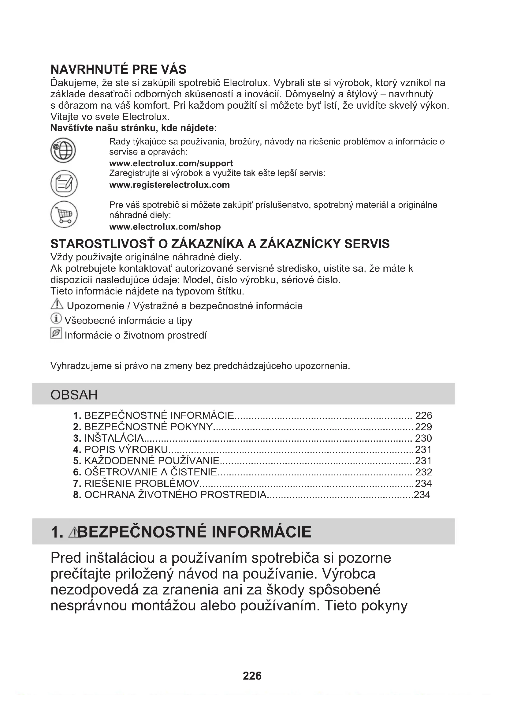 Ďakujeme, že ste si zakúpili spotrebič Electrolux. Vybrali ste si výrobok, ktorý vznikol nazáklade desaťročí odborných skúseností a inovácií. Dômyselný a štýlový – navrhnutýs dôrazom na váš komfort. Pri každom použití si môžete byť istí, že uvidíte skvelý výkon.Vitajte vo svete Electrolux.Navštívte našu stránku, kde nájdete:Rady týkajúce sa používania, brožúry, návody na riešenie problémov a informácie oservise a opravách:www.electrolux.com/supportZaregistrujte si výrobok a využite tak ešte lepší servis:www.registerelectrolux.comPre váš spotrebič si môžete zakúpiť príslušenstvo, spotrebný materiál a originálnenáhradné diely:www.electrolux.com/shop STAROSTLIVOSŤ O ZÁKAZNÍKA A ZÁKAZNÍCKY SERVIS Vždy používajte originálne náhradné diely.Ak potrebujete kontaktovať autorizované servisné stredisko, uistite sa, že máte kdispozícii nasledujúce údaje: Model, číslo výrobku, sériové číslo.Tieto informácie nájdete na typovom štítku. Upozornenie / Výstražné a bezpečnostné informácie Všeobecné informácie a tipy Informácie o životnom prostredíVyhradzujeme si právo na zmeny bez predchádzajúceho upozornenia. OBSAH