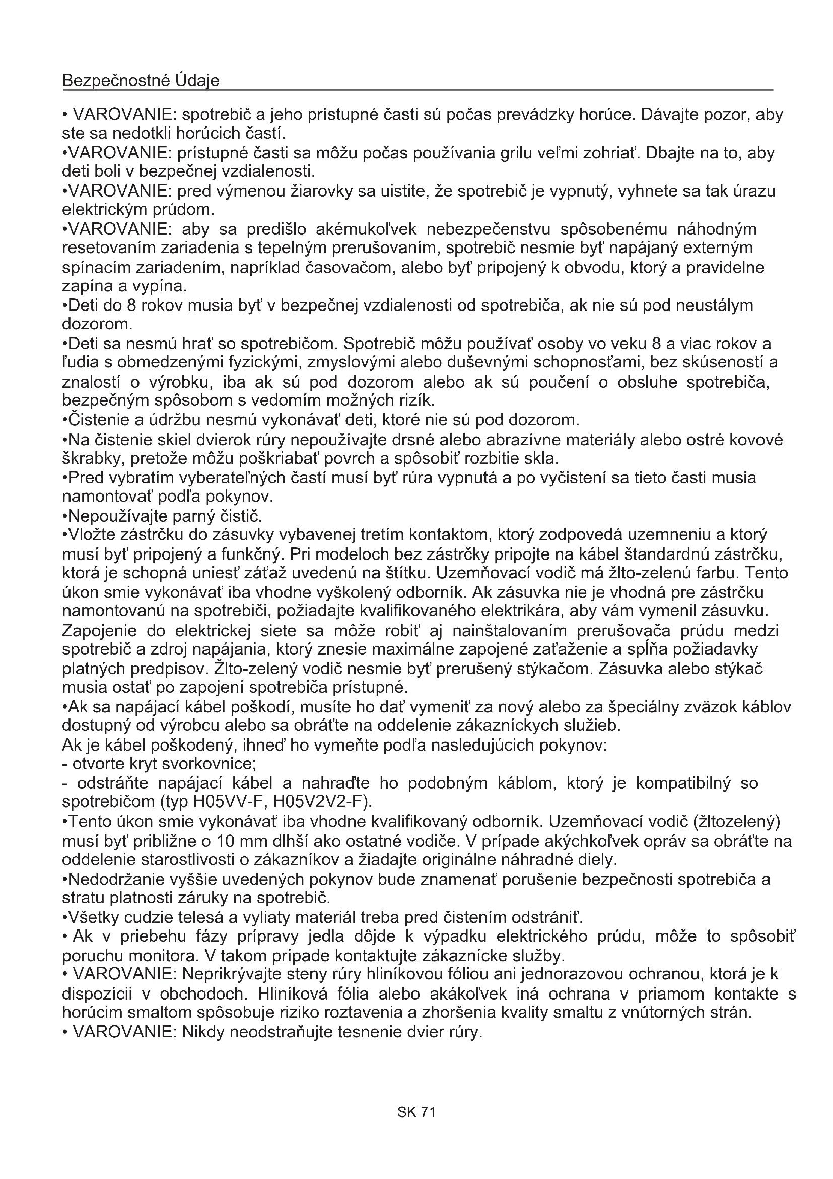 - Nedodržanie vyššie uvedených pokynov bude znamenať porušenie bezpečnosti spotrebiča a stratu platnosti záruky na spotrebič.