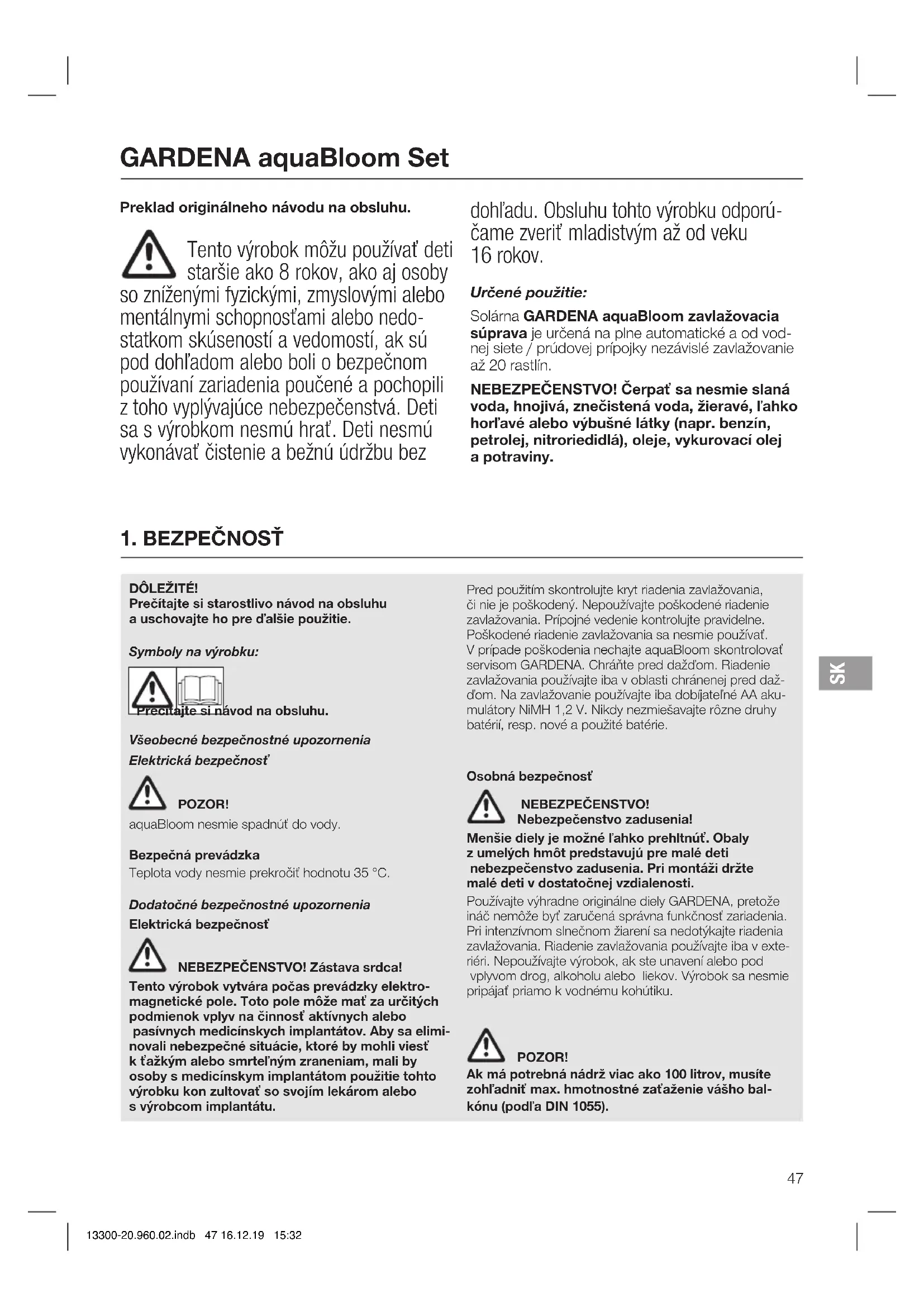 13300-20.960.02.indb 46 16.12.19 15:32Preklad originálneho návodu na obsluhu. Tento výrobok môžu používať deti staršie ako 8 rokov, ako aj osoby so zníženými fyzickými, zmyslovými alebo mentálnymi schopnosťami alebo nedo- statkom skúseností a vedomostí, ak sú pod dohľadom alebo boli o bezpečnom používaní zariadenia poučené a pochopili z toho vyplývajúce nebezpečenstvá. Deti sa s výrobkom nesmú hrať. Deti nesmú vykonávať čistenie a bežnú údržbu bez dohľadu. Obsluhu tohto výrobku odporú- čame zveriť mladistvým až od veku 16rokov. Určené použitie: Solárna GARDENA aquaBloom zavlažovacia súprava je určená na plne automatické a od vod- nej siete / prúdovej prípojky nezávislé zavlažovanie až 20 rastlín. NEBEZPEČENSTVO! Čerpať sa nesmie slaná voda, hnojivá, znečistená voda, žieravé, ľahko horľavé alebo výbušné látky (napr. benzín, petrolej, nitroriedidlá), oleje, vykurovací olej apotraviny.