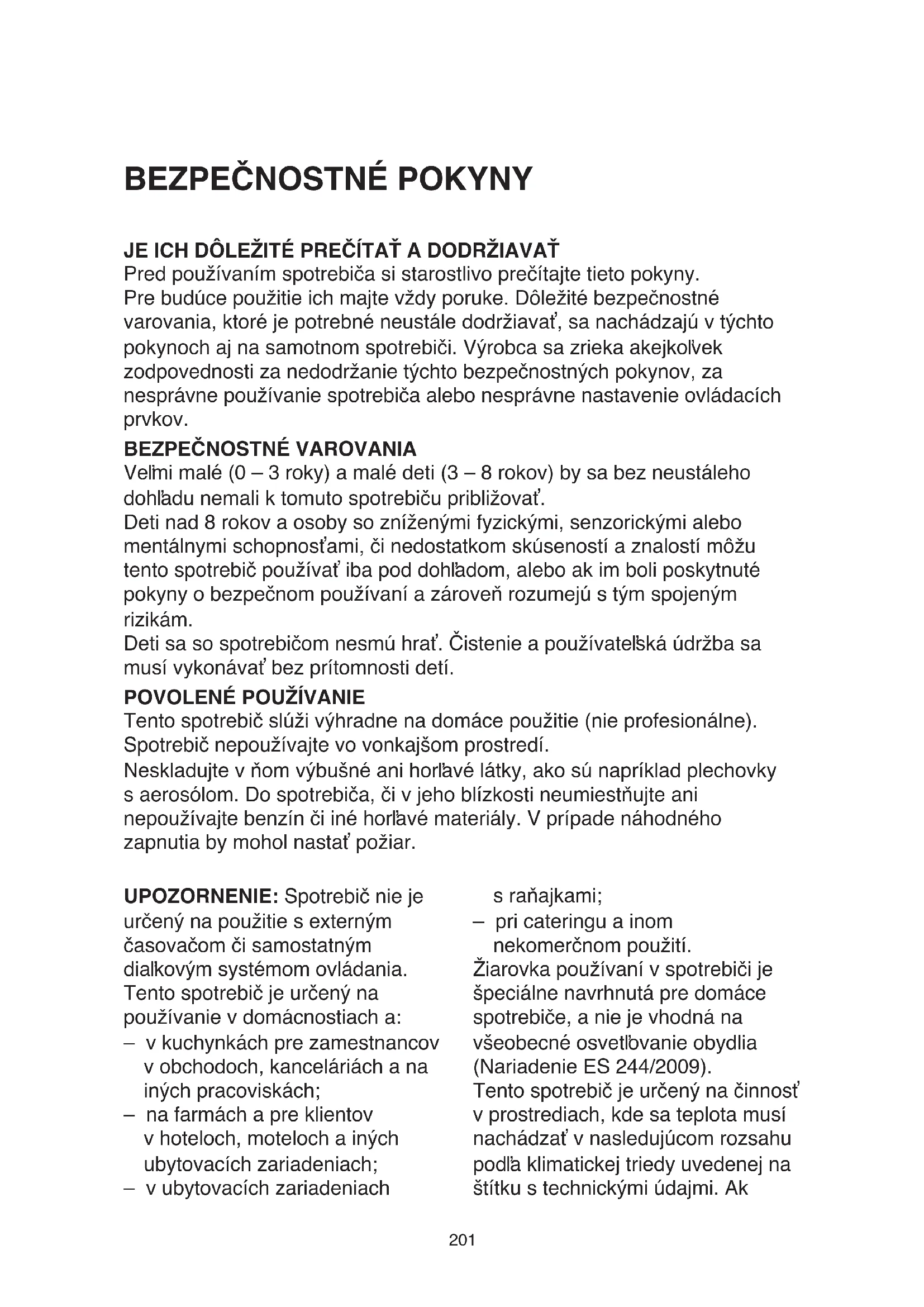 JE ICH DÔLEŽITÉ PREČÍTAŤ A DODRŽIAVAŤ Pred používaním spotrebiča si starostlivo prečítajte tieto pokyny. Pre budúce použitie ich majte vždy poruke. Dôležité bezpečnostné varovania, ktoré je potrebné neustále dodržiavať, sa nachádzajú v týchto pokynoch aj na samotnom spotrebiči. Výrobca sa zrieka akejkoľvek zodpovednosti za nedodržanie týchto bezpečnostných pokynov, za nesprávne používanie spotrebiča alebo nesprávne nastavenie ovládacích prvkov.