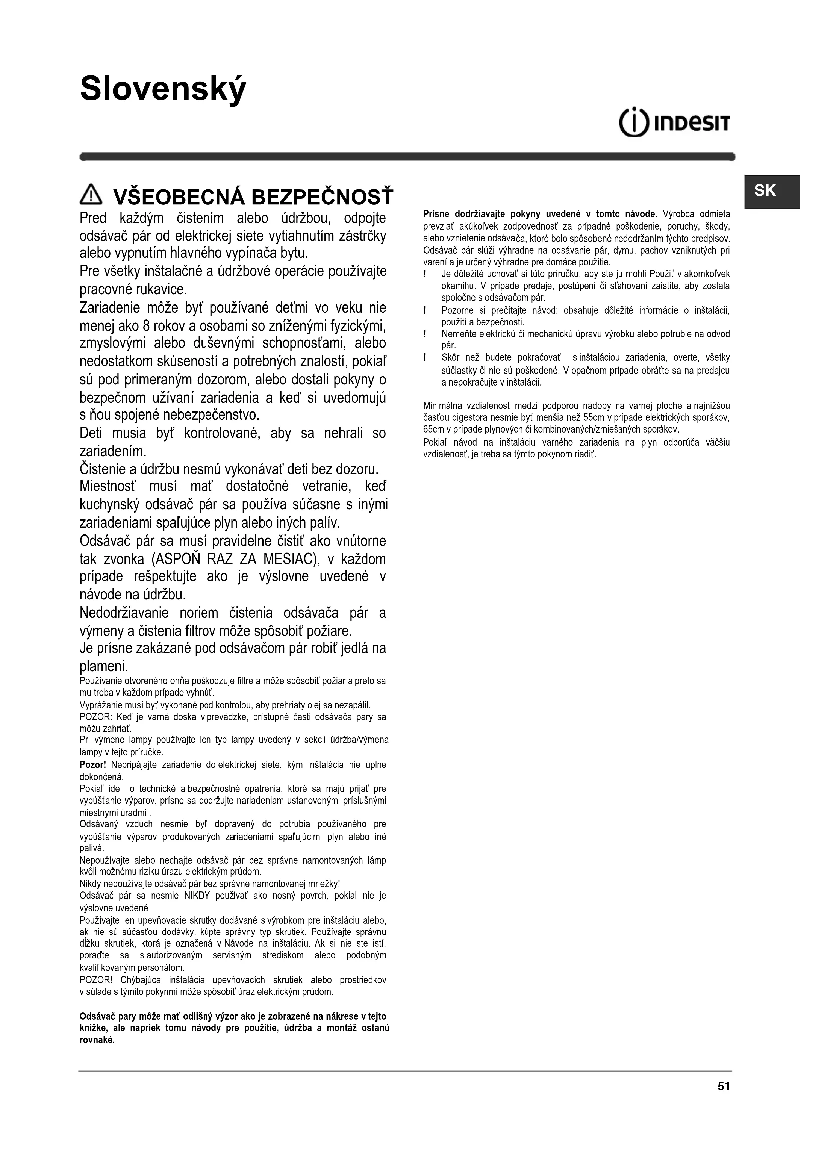 Pred každým čistením alebo údržbou, odpojte odsávač pár od elektrickej siete vytiahnutím zástrčky alebo vypnutím hlavného vypínača bytu. Pre všetky inštalačné a údržbové operácie používajte pracovné rukavice. Zariadenie môže byť používané deťmi vo veku nie menej ako 8 rokov a osobami so zníženými fyzickými, zmyslovými alebo duševnými schopnosťami, alebo nedostatkom skúseností a potrebných znalostí, pokiaľ sú pod primeraným dozorom, alebo dostali pokyny o bezpečnom užívaní zariadenia a keď si uvedomujú s ňou spojené nebezpečenstvo. Deti musia byť kontrolované, aby sa nehrali so zariadením. Čistenie a údržbu nesmú vykonávať deti bez dozoru. Miestnosť musí mať dostatočné vetranie, keď kuchynský odsávač pár sa používa súčasne s inými zariadeniami spaľujúce plyn alebo iných palív. Odsávač pár sa musí pravidelne čistiť ako vnútorne tak zvonka (ASPOŇ RAZ ZA MESIAC), v každom prípade rešpektujte ako je výslovne uvedené v návode na údržbu. Nedodržiavanie noriem čistenia odsávača pár a výmeny a čistenia filtrov môže spôsobiť požiare. Je prísne zakázané pod odsávačom pár robiť jedlá na plameni. Používanie otvoreného ohňa poškodzuje filtre a môže spôsobiť požiar a preto sa mu treba v každom prípade vyhnúť. Vyprážanie musí byť vykonané pod kontrolou, aby prehriaty olej sa nezapálil. POZOR: Keď je varná doska v prevádzke, prístupné časti odsávača pary sa môžu zahriať. Pri výmene lampy používajte len typ lampy uvedený v sekcii údržba/výmena lampy v tejto príručke. Pozor! Nepripájajte zariadenie do elektrickej siete, kým inštalácia nie úplne dokončená. Pokiaľ ide o technické a bezpečnostné opatrenia, ktoré sa majú prijať pre vypúšťanie výparov, prísne sa dodržujte nariadeniam ustanovenými príslušnými miestnymi úradmi . Odsávaný vzduch nesmie byť dopravený do potrubia používaného pre vypúšťanie výparov produkovaných zariadeniami spaľujúcimi plyn alebo iné palivá. Nepoužívajte alebo nechajte odsávač pár bez správne namontovaných lámp kvôli možnému riziku úrazu elektrickým prúdom. Nikdy nepoužívajte odsávač pár bez správne namontovanej mriežky! Odsávač pár sa nesmie NIKDY používať ako nosný povrch, pokiaľ nie je výslovne uvedené Používajte len upevňovacie skrutky dodávané s výrobkom pre inštaláciu alebo, ak nie sú súčasťou dodávky, kúpte správny typ skrutiek. Používajte správnu dĺžku skrutiek, ktorá je označená v Návode na inštaláciu. Ak si nie ste istí, poraďte sa s autorizovaným servisným strediskom alebo podobným kvalifikovaným personálom. POZOR! Chýbajúca inštalácia upevňovacích skrutiek alebo prostriedkov v súlade s týmito pokynmi môže spôsobiť úraz elektrickým prúdom. Odsávač pary môže mať odlišný výzor ako je zobrazené na nákrese v tejto knižke, ale napriek tomu návody pre použitie, údržba a montáž ostanú rovnaké. Prísne dodržiavajte pokyny uvedené v tomto návode. Výrobca odmieta prevziať akúkoľvek zodpovednosť za prípadné poškodenie, poruchy, škody, alebo vznietenie odsáva ča, ktoré bolo spôsobené nedodržaním týchto predpisov. Odsávač pár slúži výhradne na odsávanie pár, dymu, pachov vzniknutých pri varení a je určený výhradne pre domáce použitie. ! Je dôležité uchovať si túto príručku, aby ste ju mohli Použiť v akomkoľvek okamihu. V prípade predaje, postúpení či sťahovaní zaistite, aby zostala spoločne s odsávačom pár. ! Pozorne si prečítajte návod: obsahuje dôležité informácie o inštalácii, použití a bezpečnosti. ! Nemeňte elektrickú či mechanickú úpravu výrobku alebo potrubie na odvod pár. ! Skôr než budete pokračovať s inštaláciou zariadenia, overte, všetky súčiastky či nie sú poškodené. V opačnom prípade obráťte sa na predajcu a nepokračujte v inštalácii. Minimálna vzdialenosť medzi podporou nádoby na varnej ploche a najnižšou časťou digestora nesmie byť menšia než 55cm v prípade elektrických sporákov, 65cm v prípade plynových či kombinovaných/zmiešaných sporákov. Pokiaľ návod na inštaláciu varného zariadenia na plyn odporúča väčšiu vzdialenosť, je treba sa týmto pokynom riadiť.52 ELEKTRICKÉ PRIPOJENIE Sieťové napätie musí zodpovedať napätiu uvedenému na štítku s charakteristikami umiestnenom vo vnútri odsávača. Pokiaľ je odsávač vybavený prípojkou/vidlicou, stačí ju zapojiť do zásuvky zodpovedajúcej aktuálnym normám, ktorá sa nachádza v ľahko dosiahnuteľnom priestore aj po prevedenej montáži. Pokiaľ odsávač nie je vybavený prípojkami/vidlicou (priame pripojenie k sieti) alebo sa zásuvka nenachádza v ľahko dosiahnuteľnom priestore aj po prevedení montáže, je nutné použiť dvojpólový vypínač zodpovedajúci normám, ktorý zaručí úplné odpojenie od siete v podmienkach kategórie prepätí III, v súlade s pravidlami inštalácie. Upozornenie! Skôr než opäť napojíte obvod digestora na sieťové napájanie a overíte správne fungovanie, skontrolujte si vždy, že sieťový kábel bol správne namontovaný. Výmena napájacieho kábla Upozornenie! Výmena napájacieho kábla musí byť prevedená príslušnou schválenou technickou službou.