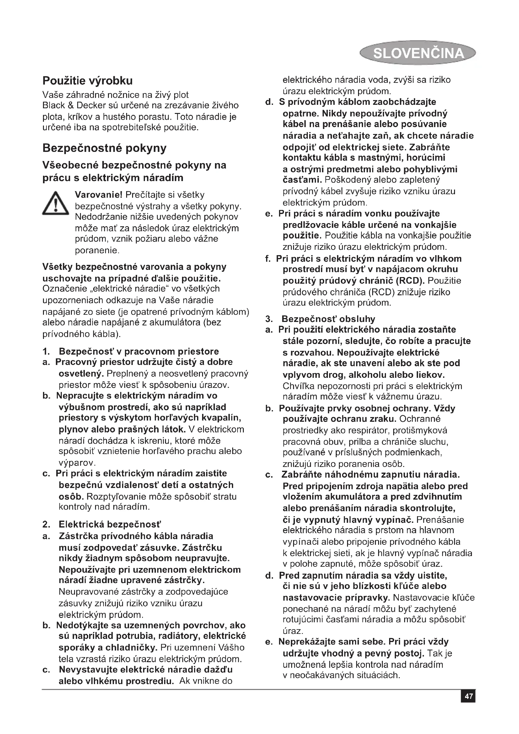zawiesza uprawnień kupującego wynikających z niezgodności towaru z umową. Centralny Serwis Gwarancyjny ERPATECH ul. Bakaliowa 26, 05-080 Mościska tel.: (22) 862-08-08, (22) 431-05-05 faks: (22) 862-08-0947 SLOVENČINA Použitie výrobku Vaše záhradné nožnice na živý plot Black & Decker sú určené na zrezávanie živého plota, kríkov a hustého porastu. Toto náradie je určené iba na spotrebiteľské použitie. Bezpečnostné pokyny Všeobecné bezpečnostné pokyny na prácu s elektrickým náradím Varovanie! Prečítajte si všetky bezpečnostné výstrahy a všetky pokyny. Nedodržanie nižšie uvedených pokynov môže mať za následok úraz elektrickým prúdom, vznik požiaru alebo vážne poranenie. Všetky bezpečnostné varovania a pokyny uschovajte na prípadné ďalšie použitie. Označenie „elektrické náradie“ vo všetkých upozorneniach odkazuje na Vaše náradie napájané zo siete (je opatrené prívodným káblom) alebo náradie napájané z akumulátora (bez prívodného kábla).