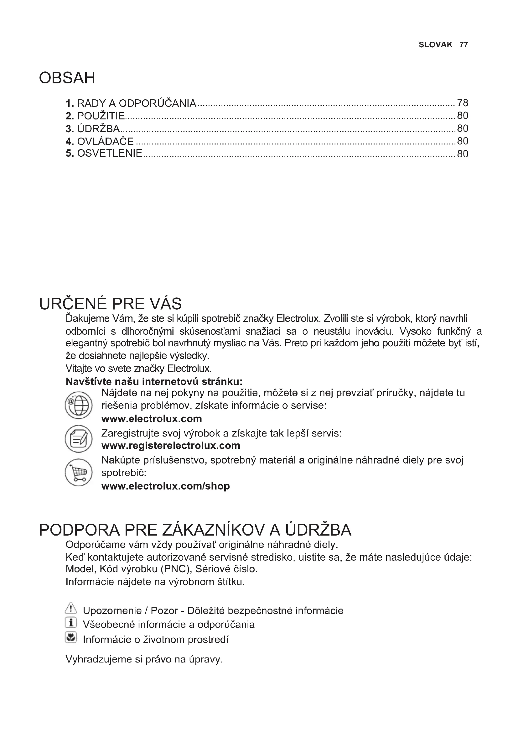 Ďakujeme Vám, že ste si kúpili spotrebič značky Electrolux. Zvolili ste si výrobok, ktorý navrhli odborníci s dlhoročnými skúsenosťami snažiaci sa o neustálu inováciu. Vysoko funkčný a elegantný spotrebič bol navrhnutý mysliac na Vás. Preto pri každom jeho použití môžete byť istí, že dosiahnete najlepšie výsledky. Vitajte vo svete značky Electrolux. Navštívte našu internetovú stránku: Nájdete na nej pokyny na použitie, môžete si z nej prevziať príručky, nájdete tu riešenia problémov, získate informácie o servise: www.electrolux.com Zaregistrujte svoj výrobok a získajte tak lepší servis: www.registerelectrolux.com Nakúpte príslušenstvo, spotrebný materiál a originálne náhradné diely pre svoj spotrebič: www.electrolux.com/shop PODPORA PRE ZÁKAZNÍKOV A ÚDRŽBA Odporúčame vám vždy používať originálne náhradné diely. Keď kontaktujete autorizované servisné stredisko, uistite sa, že máte nasledujúce údaje: Model, Kód výrobku (PNC), Sériové číslo. Informácie nájdete na výrobnom štítku. Upozornenie / Pozor - Dôležité bezpečnostné informácie Všeobecné informácie a odporúčania Informácie o životnom prostredí Vyhradzujeme si právo na úpravy.78 www.electrolux.com
