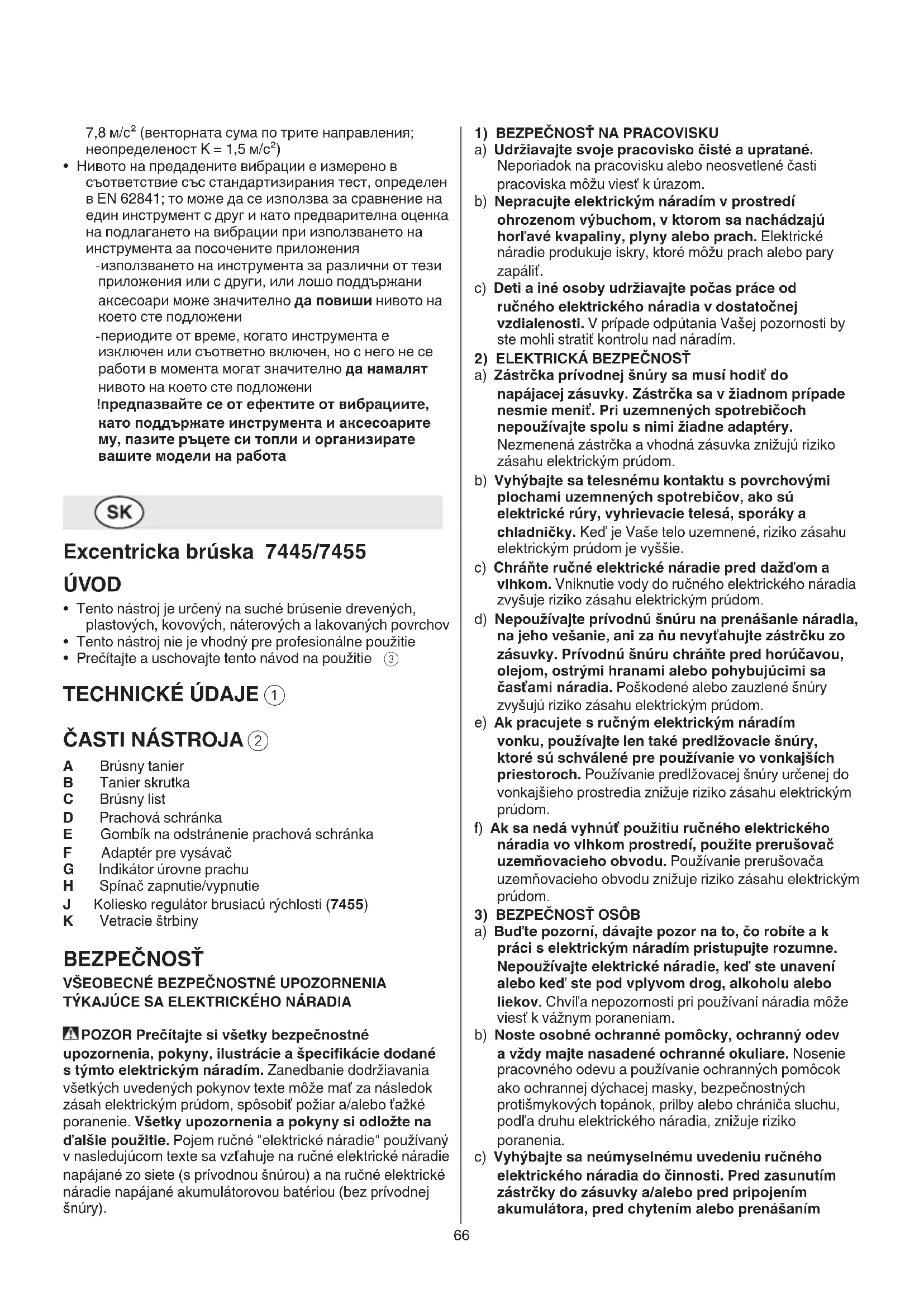 A Brúsny tanier B Tanier skrutka C Brúsny list D Prachová schránka E Gombík na odstránenie prachová schránka F Adaptér pre vysávač G Indikátor úrovne prachu H Spínač zapnutie/vypnutie J Koliesko regulátor brusiacú rýchlosti (7455) K Vetracie štrbiny BEZPEČNOSŤ