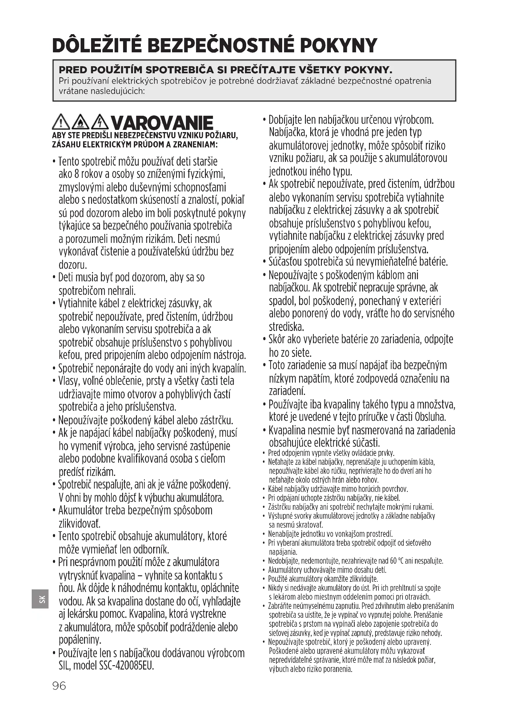 - Používajte len s nabíjačkou dodávanou výrobcom SIL, model SSC-420085EU.