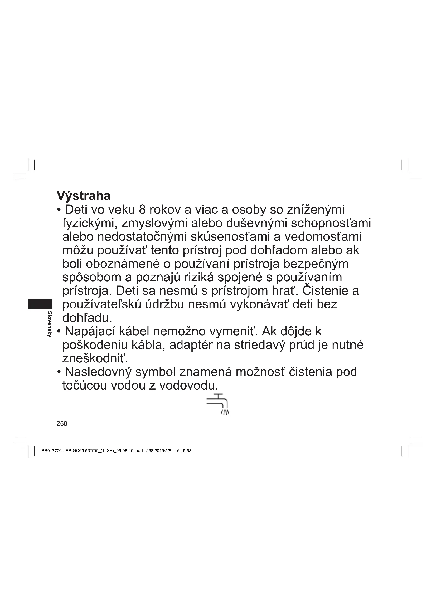 - Nepoškodzujte, neupravujte, nasilu neohýbajte, nenaťahujte kábel ani elektrickú zástrčku. Taktiež na kábel nič ťažké neklaďte a zabráňte jeho skrúteniu alebo privretiu. - V opačnom prípade môže dôjsť k zasiahnutiu elektrickým prúdom alebo k požiaru v dôsledku skratu. Výrobok nikdy nepoužívajte pri prekročení menovitých hodnôt elektrickej zásuvky alebo kabeláže. - Prekročenie menovitých hodnôt pripojením veľmi veľa zástrčiek k jednej elektrickej zásuvke môže spôsobiť požiar v dôsledku prehrievania. PB017706 - ER-GC63 53_(14SK)_05-08-19.indd 271 2019/5/8 16:15:56272 Slovensky VÝSTRAHA Uistite sa, že zariadenie je vždy pripojené k zdroju elektrickej energie so zhodným menovitým napätím uvedeným na adaptéri na striedavý prúd. Dôkladne zasuňte adaptér. - Opomenutím môže dôjsť k požiaru alebo k zasiahnutiu elektrickým prúdom. Počas čistenia vždy odpojte adaptér z elektrickej zásuvky. - Opomenutím môže dôjsť k zasiahnutiu elektrickým prúdom alebo poraneniu. Elektrickú zástrčku a zástrčku prístroja pravidelne čistite, aby sa zabránilo usádzaniu prachu. - Opomenutím môže dôjsť k požiaru kvôli chybe izolácie spôsobenej vlhkosťou.