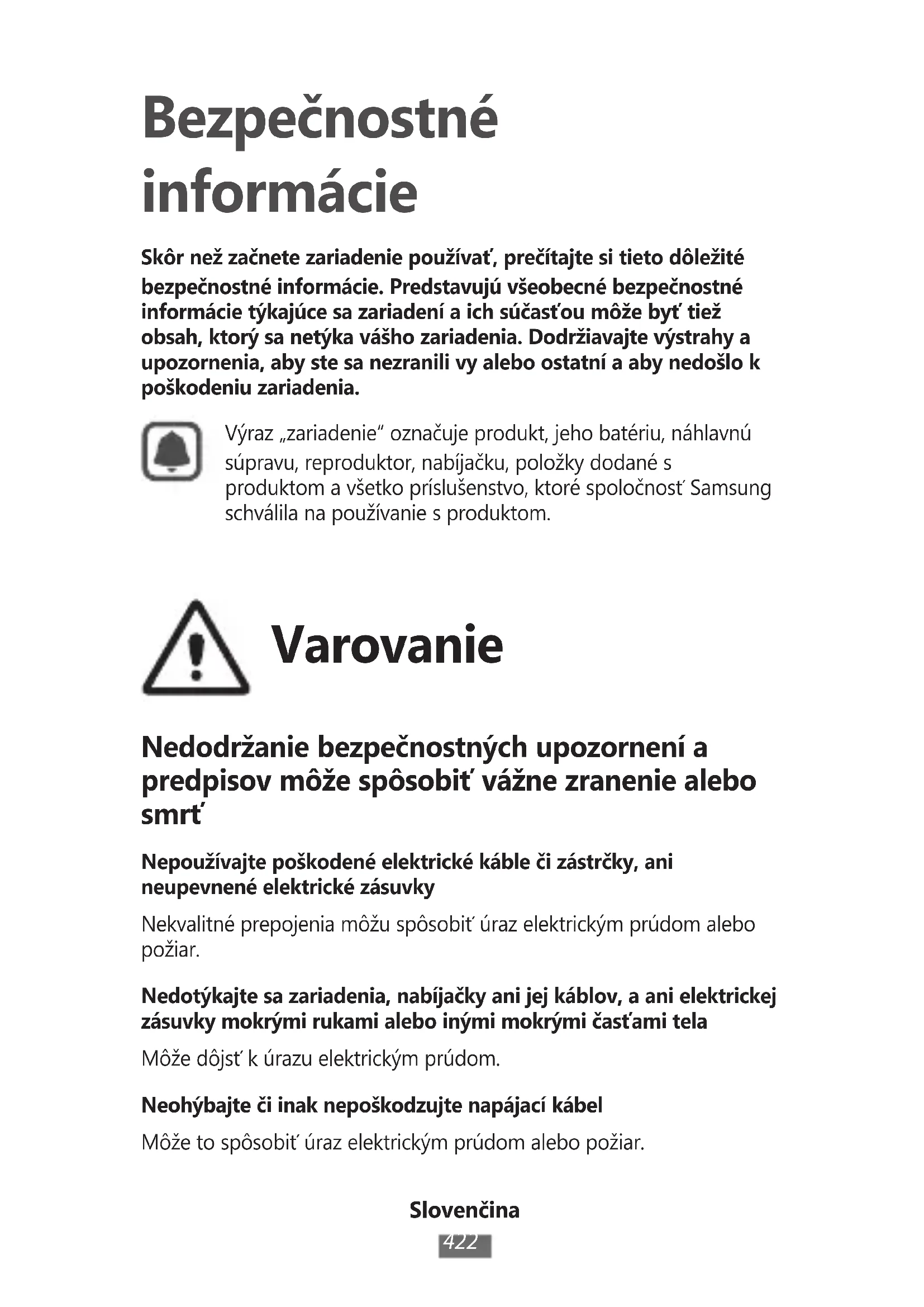 Bezpečnostné informácie Skôr než začnete zariadenie používať, prečítajte si tieto dôležité bezpečnostné informácie. Predstavujú všeobecné bezpečnostné informácie týkajúce sa zariadení a ich súčasťou môže byť tiež obsah, ktorý sa netýka vášho zariadenia. Dodržiavajte výstrahy a upozornenia, aby ste sa nezranili vy alebo ostatní a aby nedošlo k poškodeniu zariadenia.Výraz „zariadenie“ označuje produkt, jeho batériu, náhlavnú súpravu, reproduktor, nabíjačku, položky dodané s produktom a všetko príslušenstvo, ktoré spoločnosť Samsung schválila na používanie s produktom. Varovanie Nedodržanie bezpečnostných upozornení a predpisov môže spôsobiť vážne zranenie alebo smrť Nepoužívajte poškodené elektrické káble či zástrčky, ani neupevnené elektrické zásuvkyNekvalitné prepojenia môžu spôsobiť úraz elektrickým prúdom alebo požiar.Nedotýkajte sa zariadenia, nabíjačky ani jej káblov, a ani elektrickej zásuvky mokrými rukami alebo inými mokrými časťami telaMôže dôjsť k úrazu elektrickým prúdom.Neohýbajte či inak nepoškodzujte napájací kábelMôže to spôsobiť úraz elektrickým prúdom alebo požiar.Slovenčina