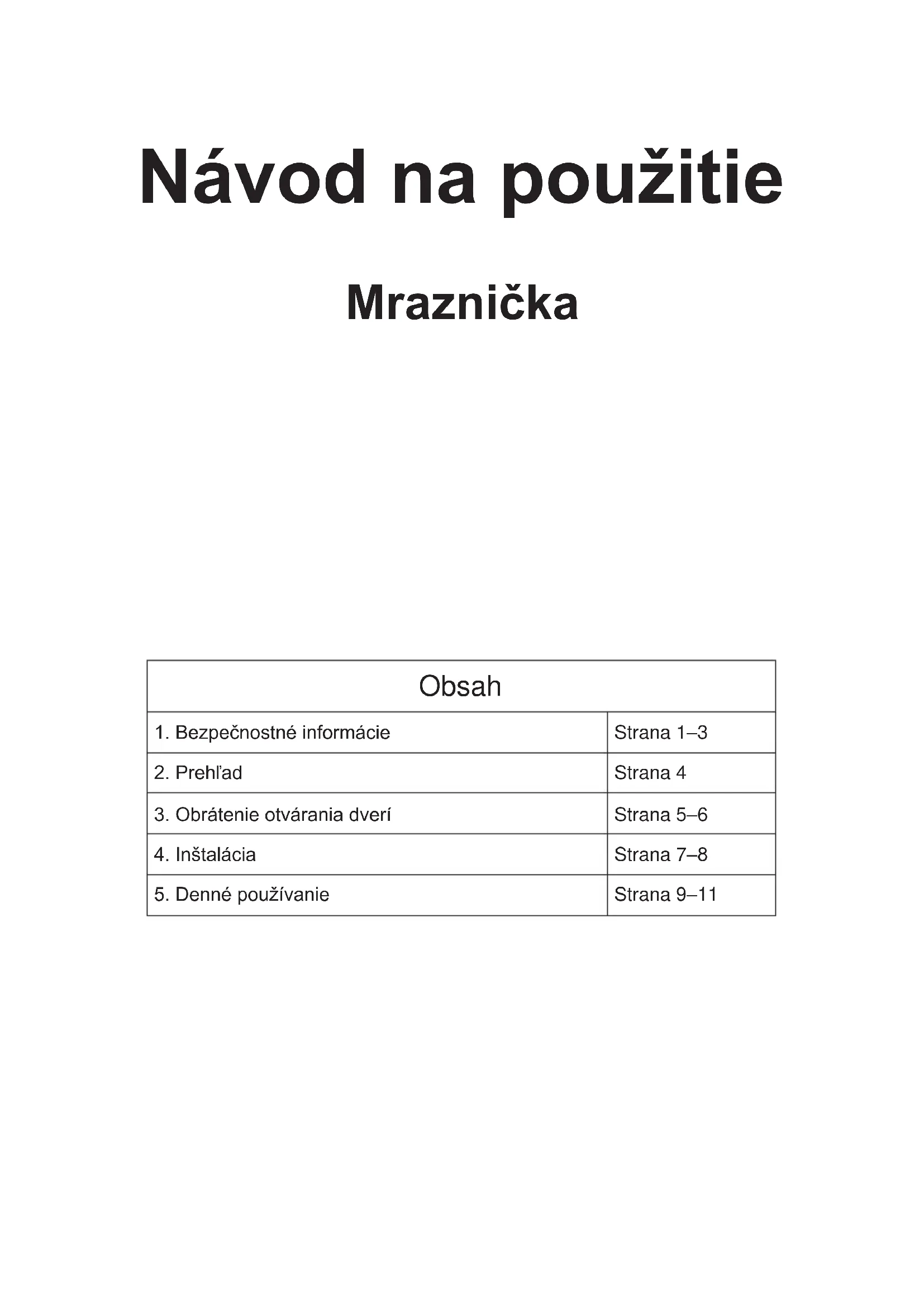 Strana 9–111 Ďakujeme vám za zakúpenie tohto výrobku. Pred použitím chladničky si pozorne prečítajte tento návod na použitie, aby ste mohli maximálne využiť jej možnosti. Uchovajte všetku dokumentáciu na budúce použitie alebo ďalších vlastníkov. Tento výrobok je určený výhradne na použitie v domácnosti alebo podobné použitia, ako sú: - kuchynské kúty pre zamestnancov v obchodoch, kanceláriách a na ďalších pracoviskách, - na statkoch, pre klientelu hotelov, motelov a ďalších ubytovacích zariadení, - v ubytovacích zariadeniach typu B&B (ubytovanie s raňajkami), - pre cateringové služby a podobné účely, nie však na maloobchodný predaj. Tento spotrebič sa smie používať iba na účely skladovania potravín, pričom akékoľvek iné použitie sa považuje za nebezpečné a výrobca nenesie zodpovednosť za prípadné nedodržanie pokynov. Odporúčame vám tiež, aby ste sa zoznámili so záručnými podmienkami.