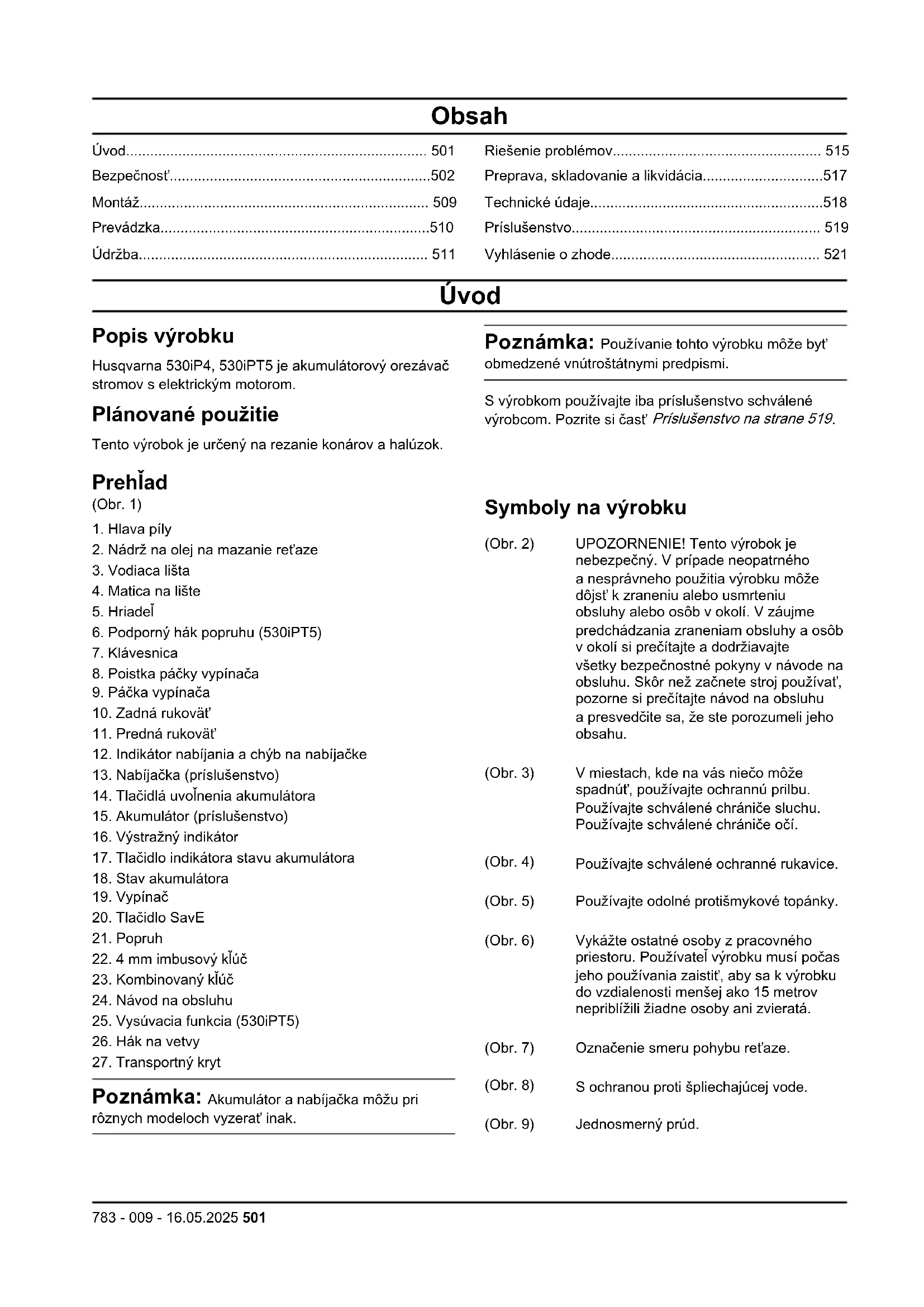 (Obr. 89) (Obr. 90) (Obr. 91) (Obr. 92) (Obr. 93) (Obr. 94) (Obr. 95) mm/palce mm/palce 37 4,0/5/32 80° 30° 0° 0,65/0,025 5056981-03 5806875-01 S93G 4,0/5/32 60° 30° 0° 0,65/0,025 – 5966389-02 520 783 - 009 - 16.05.2025Vyhlásenie o zhode Vyhlásenie o zhode EÚ My, spoločnosť Husqvarna AB, SE-561 82 Huskvarna, Švédsko, tel.: +46-36-146500, vyhlasujeme s plnou zodpovednosťou, že výrobok: Popis Orezávač stromov na batériu Značka Husqvarna Typ/model 530iP4, 530iPT5 Identifikácia Výrobné čísla od roku 2025 a novšie plne spĺňa nasledujúce smernice a nariadenia EÚ: Nariadenie Popis 2006/42/ES „o strojových zariadeniach“ 2014/30/EÚ „o elektromagnetickej kompatibilite“ 2011/65/EÚ „o obmedzení používania určitých nebezpečných látok“ a že sa pri ňom uplatňujú nasledujúce normy a technické špecifikácie: EN 62841-1:2015, EN ISO 11680-1:2021, EN ISO 14982:2009, CISPR12:2007+amd1 2009, EN IEC 63000:2018. Notifikovaný orgán: 0404, Svensk Maskinprovning AB, Box 4053, SE-904 03 Umeå, Sweden vykonal typovú skúšku ES v súlade so smernicou o strojných zariadeniach (2006/42/ES) článkom 12, bodom 3b. Certifikát má číslo: 0404/19/2530. Informácie týkajúce sa emisií hluku nájdete v časti Technické údaje na strane 518