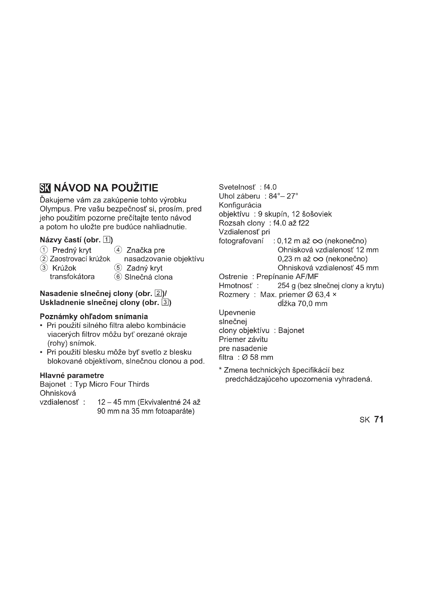 - Nemierte objektívom fotoaparátu priamo na slnko. Slnečné lúče sa v objektíve sústredia a môžu fotoaparát poškodiť alebo spôsobiť požiar. Micro Four Thirds a logo Micro Four Thirds sú ochrannou známkou a registrovanou ochrannou známkou spoločnosti OLYMPUS CORPORATION.SK 73 Softvér v tomto objektíve môže obsahovať softvér tretích strán. Akýkoľvek softvér tretích strán podlieha podmienkam, ktoré boli definované vlastníkmi alebo poskytovateľmi licencie daného softvéru, za ktorých je softvér poskytovaný. Tieto podmienky a ďalšie informácie k softvéru tretích strán, ak existujú, možno nájsť v súbore PDF s informáciami týkajúcimi sa softvéru, umiestnenom na http://www.olympus.co.jp/en/support/imsg/ digicamera/download/notice/notice.cfm Spoločnosť Olympus nebude zodpovedná za porušenie miestnych predpisov vyplývajúcich z používania tohto výrobku mimo krajiny alebo oblasti zakúpenia.74 SL NAVODILA Hvala za nakup tega izdelka podjetja Olympus. Za zagotovitev varnosti pred uporabo preberite ta priročnik in ga shranite, da bo pri roki za prihodnjo uporabo. Imena delov (sl. 1) 1 Sprednji pokrovček 2 Ostrilni obroč 3 Obroček za zoom 4 Oznaka za namestitev objektiva 5 Zadnji pokrovček 6 Zaslonka za objektiv Pritrditev zaslonke (sl. 2)/ Shranjevanje zaslonke (sl. 3) Opombe k fotografiranju