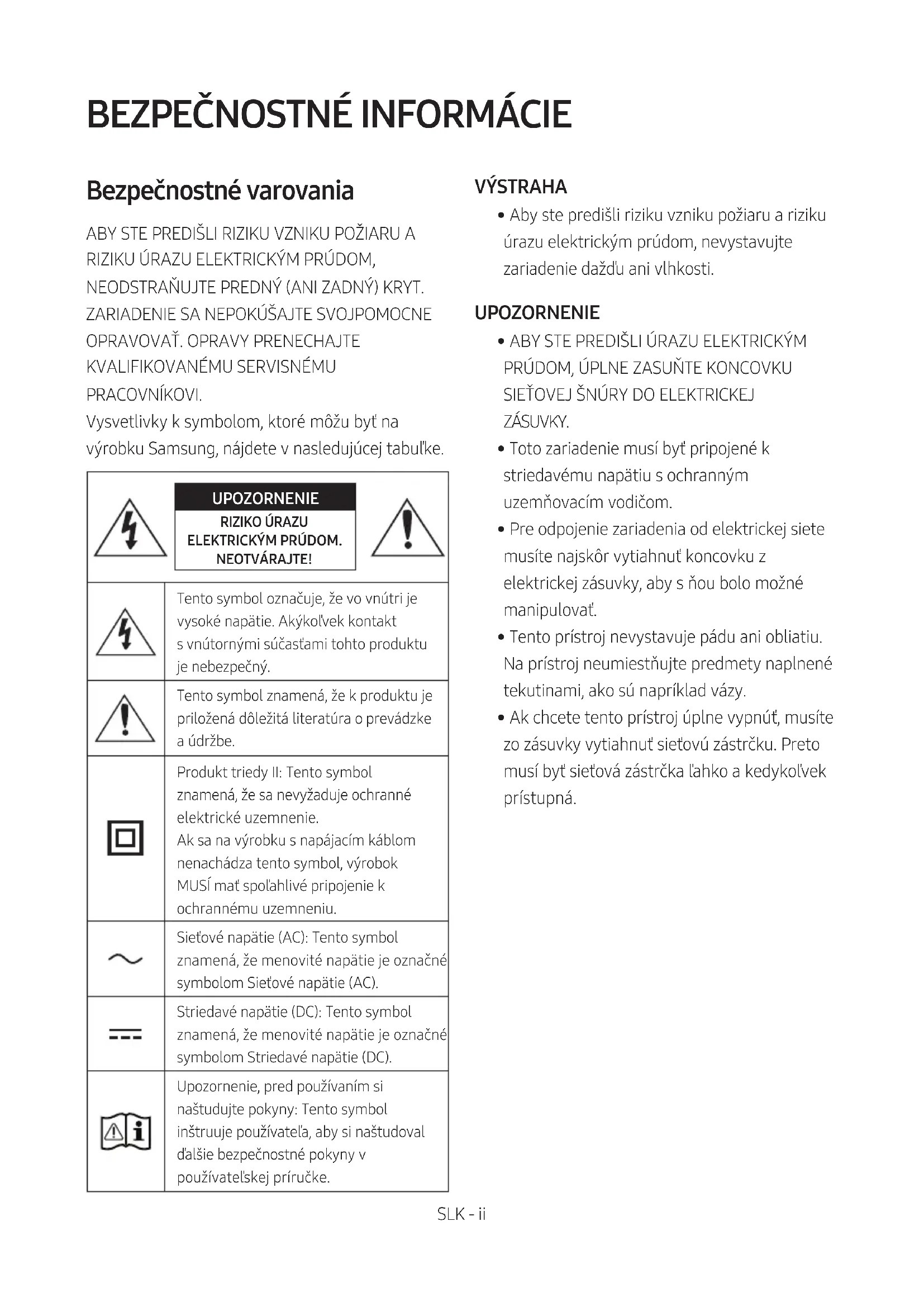 PRACOVNÍKOVI. Vysvetlivky k symbolom, ktoré môžu byť na výrobku Samsung, nájdete v nasledujúcej tabuľke. UPOZORNENIE RIZIKO ÚRAZU ELEKTRICKÝM PRÚDOM. NEOTVÁRAJTE!Tento symbol označuje, že vo vnútri je vysoké napätie. Akýkoľvek kontakt svnútornými súčasťami tohto produktu je nebezpečný.Tento symbol znamená, že kproduktu je priložená dôležitá literatúra oprevádzke a údržbe.Produkt triedy II: Tento symbol znamená, že sa nevyžaduje ochranné elektrické uzemnenie.Ak sa na výrobku s napájacím káblom nenachádza tento symbol, výrobok MUSÍ mať spoľahlivé pripojenie k ochrannému uzemneniu. Sieťové napätie (AC): Tento symbol znamená, že menovité napätie je označné symbolom Sieťové napätie (AC).Striedavé napätie (DC): Tento symbol znamená, že menovité napätie je označné symbolom Striedavé napätie (DC).Upozornenie, pred používaním si naštudujte pokyny: Tento symbol inštruuje používateľa, aby si naštudoval ďalšie bezpečnostné pokyny v používateľskej príručke. VÝSTRAHA