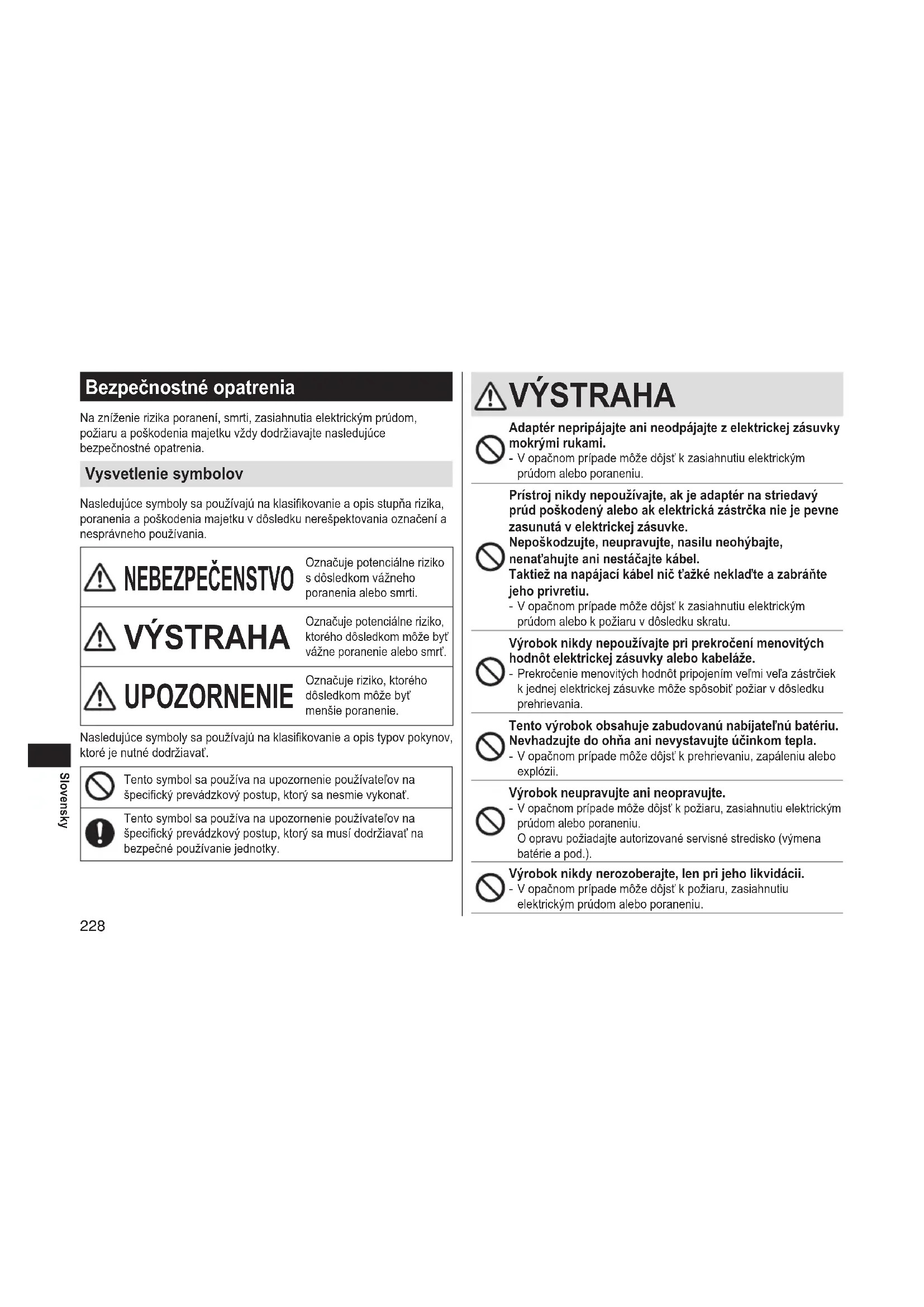 - Napájacíkábelnemožnovymeniť.Akdôjdekpoškodeniu kábla,adaptérnastriedavýprúdjenutnézneškodniť.227 Slovensky
