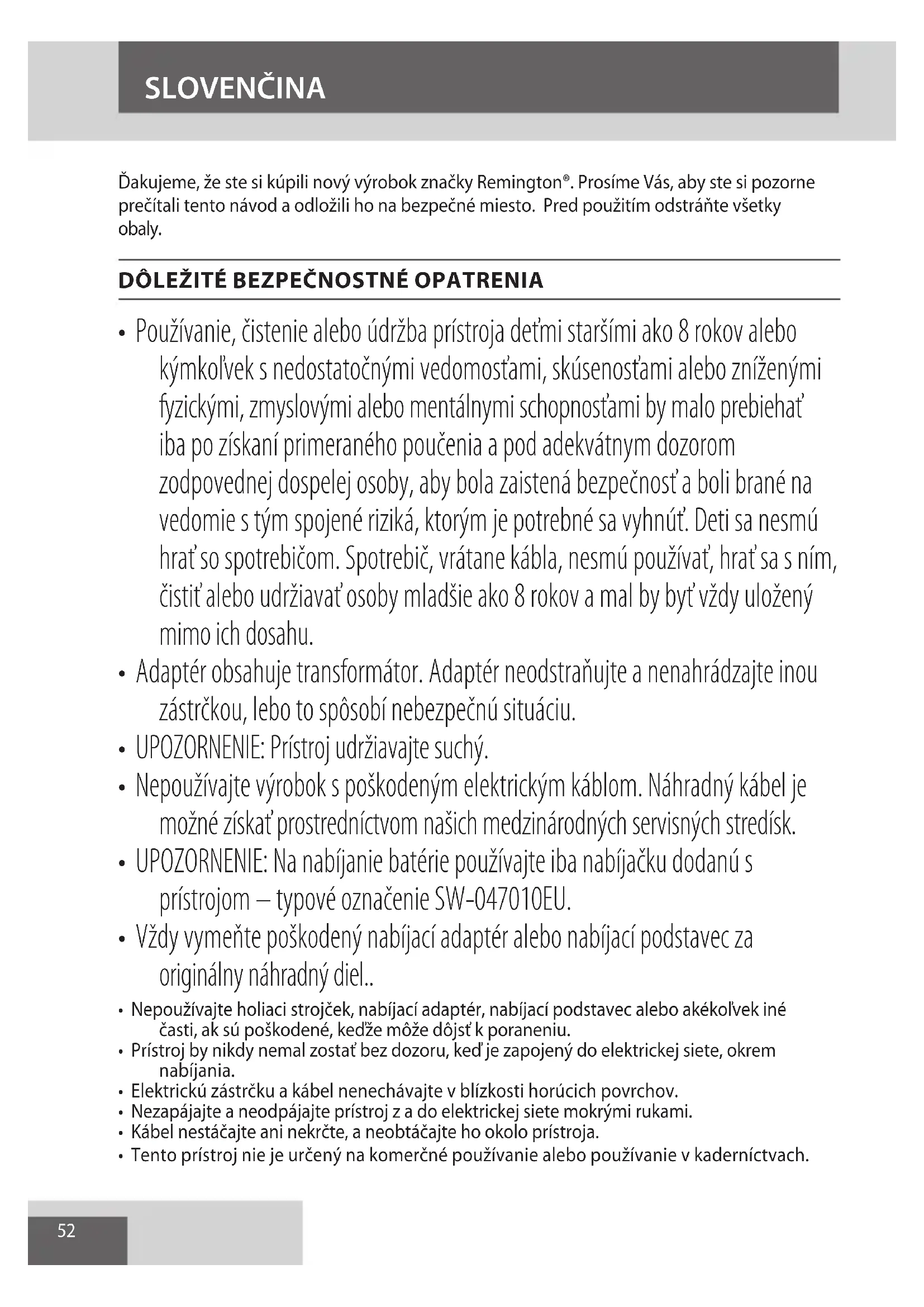 AE52 Ďakujeme, že ste si kúpili nový výrobok značky Remington®. Prosíme Vás, aby ste si pozorne prečítali tento návod a odložili ho na bezpečné miesto. Pred použitím odstráňte všetky obaly.