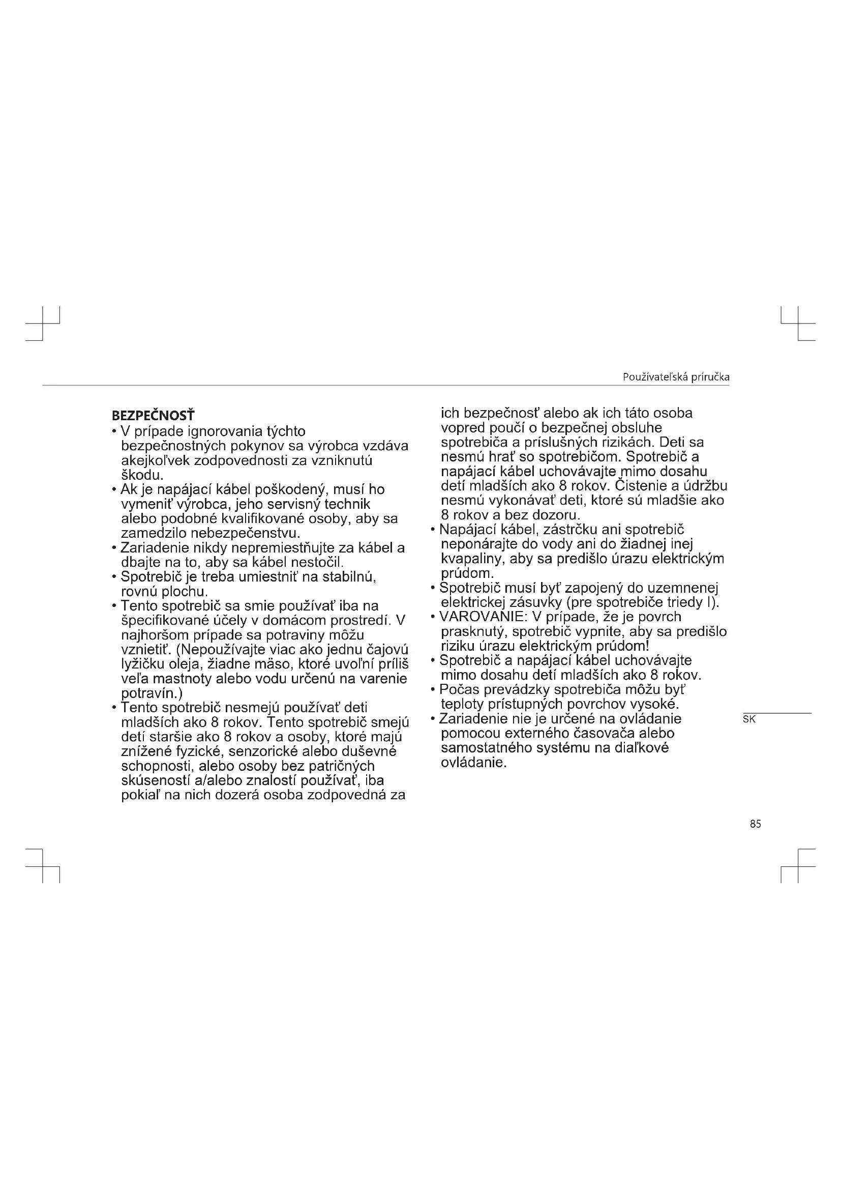 - Tento spotrebič nesmejú používať deti mladších ako 8 rokov. Tento spotrebič smejú detí staršie ako 8 rokov a osoby, ktoré majú znížené fyzické, senzorické alebo duševné schopnosti, alebo osoby bez patričných skúseností a/alebo znalostí používať, iba pokiaľ na nich dozerá osoba zodpovedná za ich bezpečnosť alebo ak ich táto osoba vopred poučí o bezpečnej obsluhe spotrebiča a príslušných rizikách. Deti sa nesmú hrať so spotrebičom. Spotrebič a napájací kábel uchovávajte mimo dosahu detí mladších ako 8 rokov. Čistenie a údržbu nesmú vykonávať deti, ktoré sú mladšie ako 8 rokov abez dozoru.