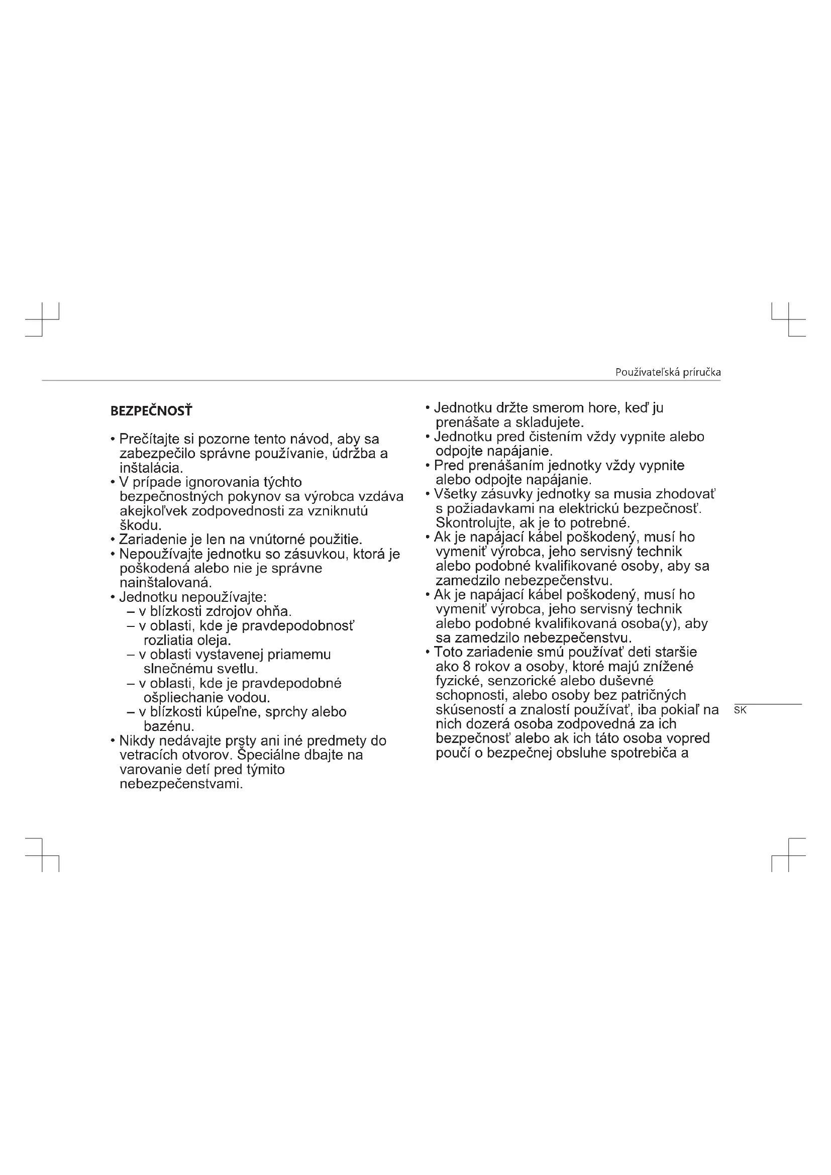 - Toto zariadenie smú používať deti staršie ako 8 rokov a osoby, ktoré majú znížené fyzické, senzorické alebo duševné schopnosti, alebo osoby bez patričných skúseností a znalostí používať, iba pokiaľ na nich dozerá osoba zodpovedná za ich bezpečnosť alebo ak ich táto osoba vopred poučí o bezpečnej obsluhe spotrebiča a SKPoužívateľská príručka príslušných rizikách. Deti sa nesmú hrať so spotrebičom. Čistenie a údržbu nesmú robiť deti bez dozoru.