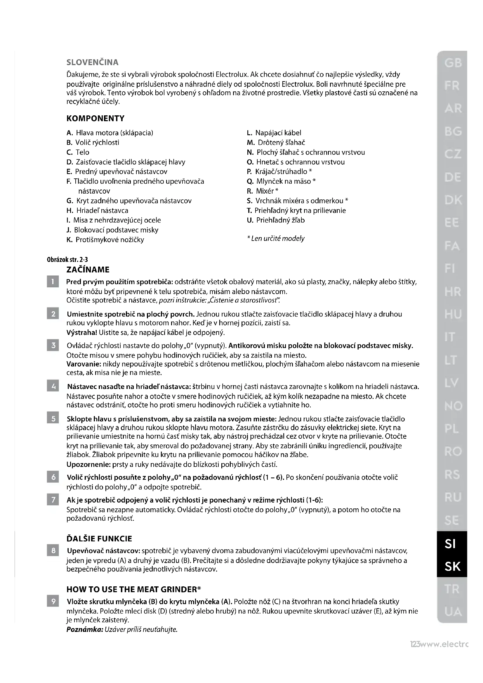 SLOVENČINA Ďakujeme, že ste si vybrali výrobok spoločnosti Electrolux. Ak chcete dosiahnuť čo najlepšie výsledky, vždy používajte originálne príslušenstvo a náhradné diely od spoločnosti Electrolux. Boli navrhnuté špeciálne pre váš výrobok. Tento výrobok bol vyrobený s ohľadom na životné prostredie. Všetky plastové časti sú označené na recyklačné účely. KOMPONENTY A. Hlava motora (sklápacia) B. Volič rýchlosti C. Telo D. Zaisťovacie tlačidlo sklápacej hlavy E. Predný upevňovač nástavcov F. Tlačidlo uvoľnenia predného upevňovača nástavcov G. Kryt zadného upevňovača nástavcov H. Hriadeľ nástavca