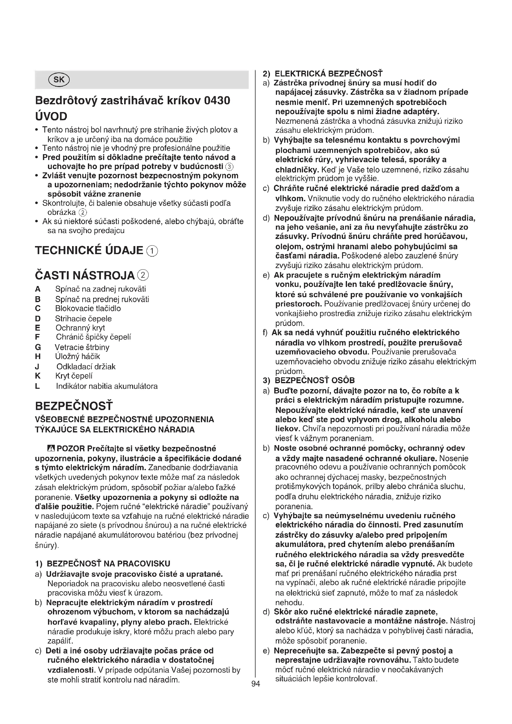 A Spínač na zadnej rukoväti B Spínač na prednej rukoväti C Blokovacie tlačidlo D Strihacie čepele E Ochranný kryt F Chránič špičky čepelí G Vetracie štrbiny H Úložný háčik J Odkladací držiak K Kryt čepelí L Indikátor nabitia akumulátora BEZPEČNOSŤ