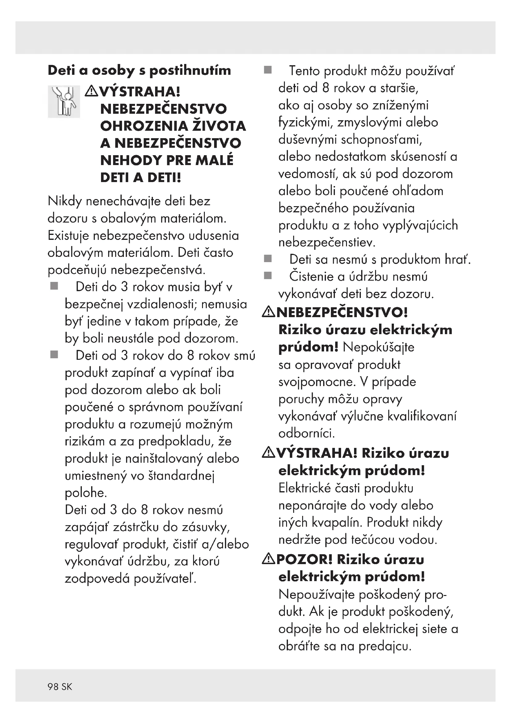 DOKUMENTÁCIU K PRODUKTU! V prípade poškodenia z dôvodu nedodržania tohto návodu na používanie zaniká nárok na záruku! Za následne vzniknuté škody nepreberáme žiadnu záruku! V prípade majetkových alebo personálnych škôd z dôvodu neodborného používania alebo nedodržania bezpečnostných upozornení nepreberáme žiadnu zodpovednosť!98 SK Deti a osoby s postihnutím mVÝSTRAHA! NEBEZPEČENSTVO OHROZENIA ŽIVOTA