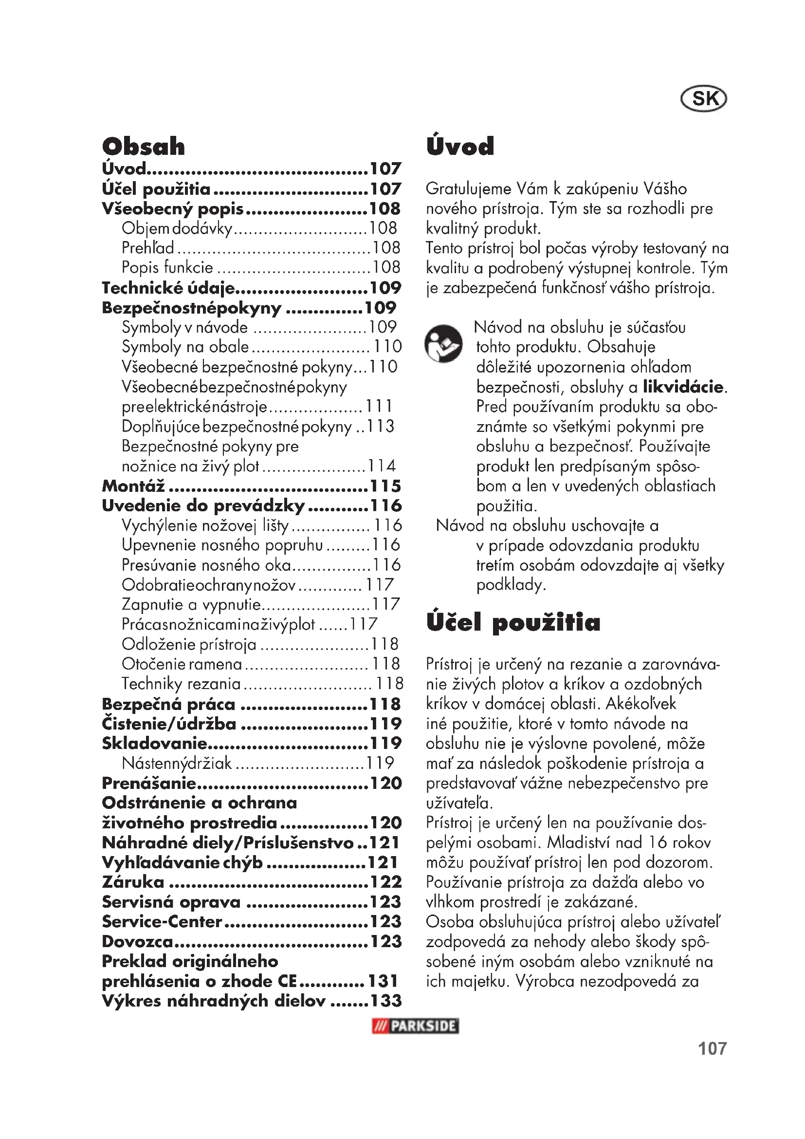 - Úvod Gratulujeme Vám k zakúpeniu Vášho nového prístroja. Tým ste sa rozhodli pre kvalitný produkt. Tento prístroj bol počas výroby testovaný na kvalitu a podrobený výstupnej kontrole. Tým je zabezpečená funkčnosť vášho prístroja. Návod na obsluhu je súčasťou tohto produktu. Obsahuje dôležité upozornenia ohľadom bezpečnosti, obsluhy a likvidácie. Pred používaním produktu sa obo- známte so všetkými pokynmi pre obsluhu a bezpečnosť. Používajte produkt len predpísaným spôso- bom a len v uvedených oblastiach použitia. Návod na obsluhu uschovajte a v prípade odovzdania produktu tretím osobám odovzdajte aj všetky podklady. Účel použitia Prístroj je určený na rezanie a zarovnáva- nie živých plotov a kríkov a ozdobných kríkov v domácej oblasti. Akékoľvek iné použitie, ktoré v tomto návode na obsluhu nie je výslovne povolené, môže mať za následok poškodenie prístroja a predstavovať vážne nebezpečenstvo pre užívateľa. Prístroj je určený len na používanie dos- pelými osobami. Mladiství nad 16 rokov môžu používať prístroj len pod dozorom. Používanie prístroja za dažďa alebo vo vlhkom prostredí je zakázané. Osoba obsluhujúca prístroj alebo užívateľ zodpovedá za nehody alebo škody spô- sobené iným osobám alebo vzniknuté na ich majetku. Výrobca nezodpovedá za Obsah Úvod p. 107