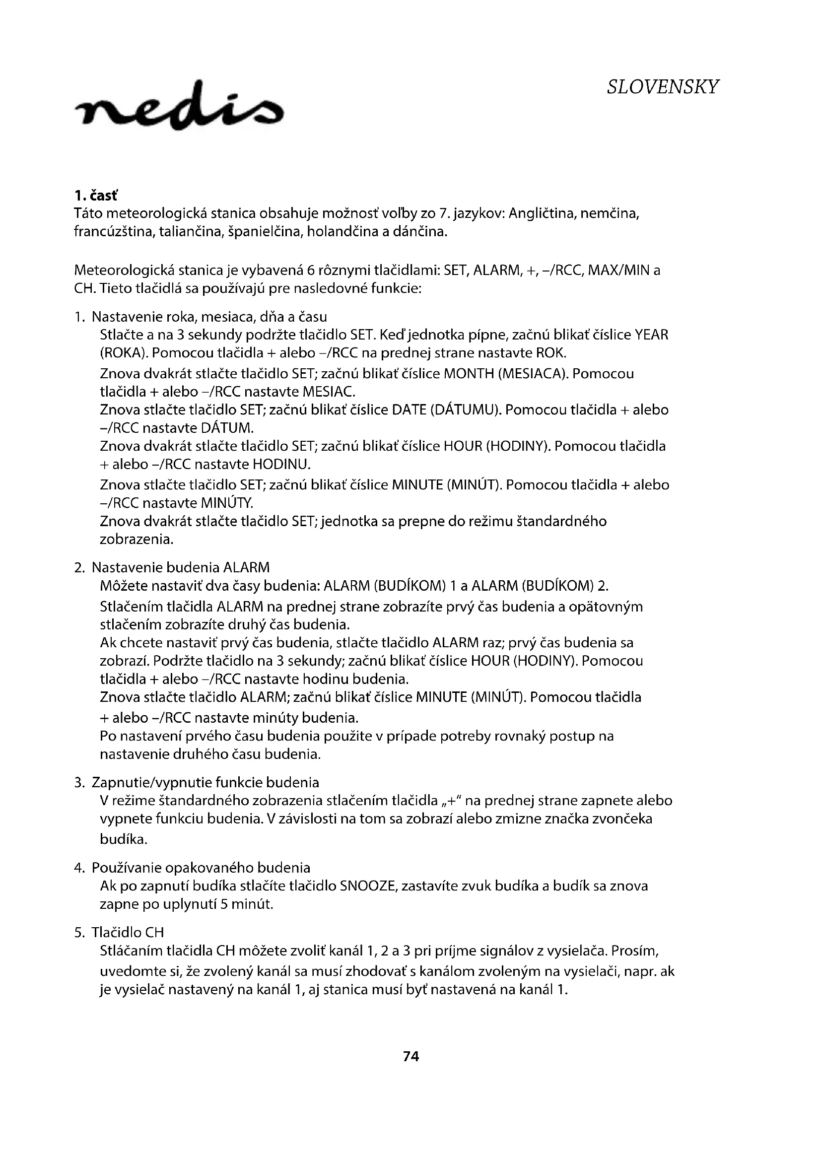 Bezpečnostné opatrenia: Vrámci zníženia rizika úrazu elektrickým prúdom môže tento výrobok otvárať VÝHRADNE poverený technik, ak je potrebný servisný zásah. Ak sa vyskytne nejaký problém, odpojte výrobok aostatné zariadenia zelektrickej siete. Nevystavujte výrobok pôsobeniu vody alebo vlhkosti. Údržba: Čistite len suchou tkaninou. Nepoužívajte čistiace prostriedky ani brúsne materiály. Záruka: Vprípade akýchkoľvek úprav výrobku alebo poškodenia spôsobeného nesprávnym používaním výrobku sa neposkytuje žiadna záruka. Všeobecné: Vzhľad a technické údaje môžu byť bez oznámenia zmenené. Všetky logá, značky anázvy výrobkov sú ochranné známky alebo registrované ochranné známky príslušných vlastníkov aako také ich uznávame. Tento návod aobal výrobku uschovajte pre možnú potrebu v budúcnosti. Pozor: Výrobok je označený týmto symbolom. Znamená to, že použité elektrické alebo elektronické výrobky nesmú byť zamiešané do bežného odpadu z domácností. Pre tieto výrobky existuje osobitný zberný systém. Tento výrobok bol vyrobený adodaný vsúlade so všetkými príslušnými predpismi asmernicami platnými pre všetky členské štáty Európskej únie. Je tiež vsúlade so všetkými normami apredpismi platnými vkrajine, kde sa predáva. Formálna dokumentácia je kdispozícii na vyžiadanie. Okrem iného sem patrí: Vyhlásenie o zhode (a identite výrobku), Bezpečnostný materiálový list aspráva otestovaní výrobku. So žiadosťou opodporu sa obráťte na zákaznícku službu: cez webovú stránku: http://www.nedis.com/en-us/contact/contact-form.htm e-mailom: service@nedis.com telefonicky: +31 (0)73-5993965 (v pracovnom čase) NEDIS B.V., De Tweeling 28, 5215 MC ’s-Hertogenbosch, THE NETHERLANDS78 LATVIEŠU I daļa Šai laika apstākļu stacijai ir 7 dažādu valodu opcijas: angļu, vācu, franču, itāļu, spāņu, holandiešu un dāņu. Laika apstākļu stacijai ir 6 dažādas pogas: SET, ALARM, +, –/RCC, MAX/MIN un CH. Šīs pogas tiek lietotas šādām funkcijām: