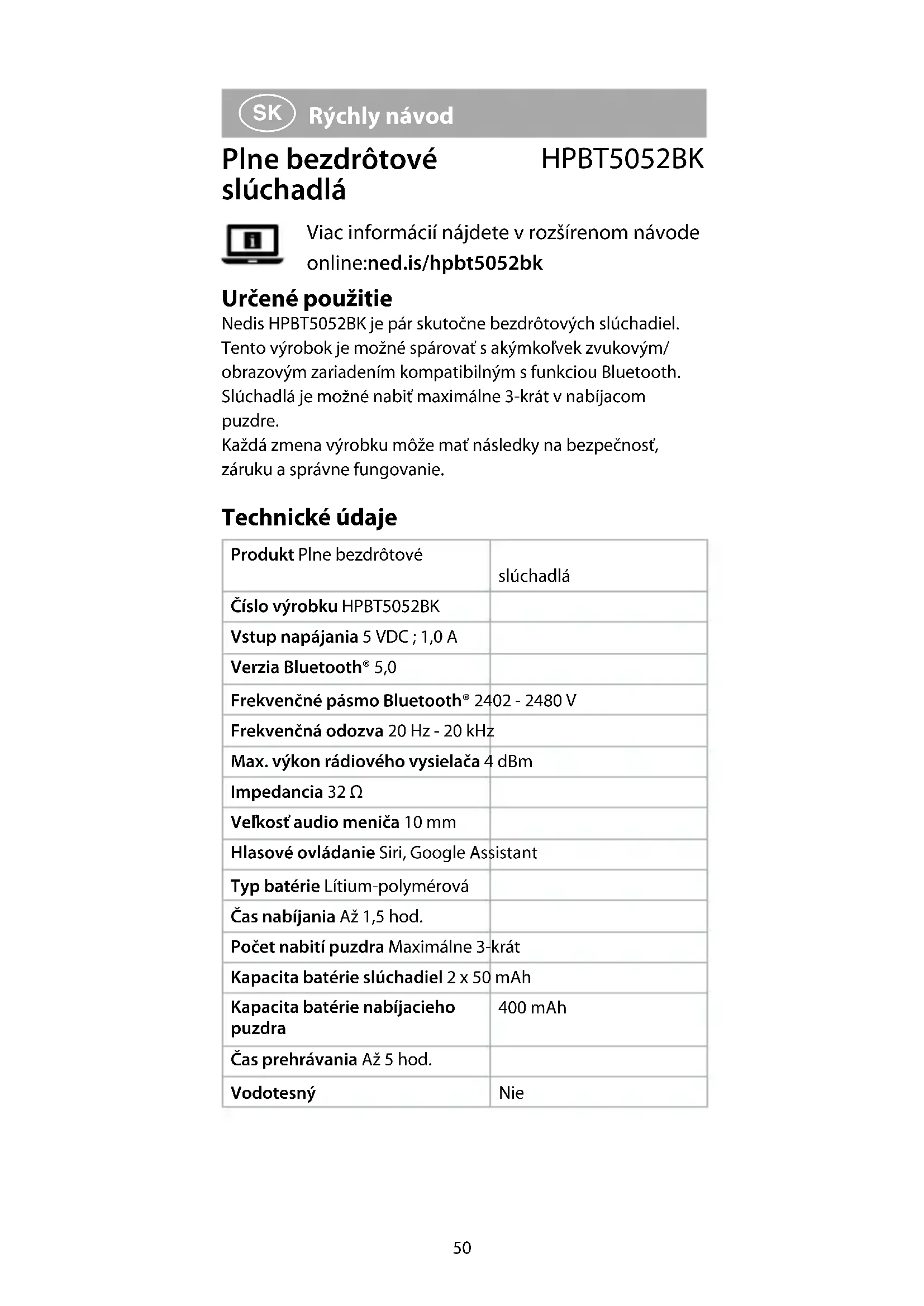 Rýchly návod Plne bezdrôtové slúchadlá HPBT5052BK Viac informácií nájdete v rozšírenom návode online:ned.is/hpbt5052bk Určené použitie Nedis HPBT5052BK je pár skutočne bezdrôtových slúchadiel. Tento výrobok je možné spárovať s akýmkoľvek zvukovým/ obrazovým zariadením kompatibilným s funkciou Bluetooth. Slúchadlá je možné nabiť maximálne 3-krát v nabíjacom puzdre. Každá zmena výrobku môže mať následky na bezpečnosť, záruku a správne fungovanie. Technické údaje Produkt Plne bezdrôtové slúchadlá Číslo výrobku HPBT5052BK Vstup napájania 5 VDC ; 1,0 A Verzia Bluetooth® 5,0 Frekvenčné pásmo Bluetooth® 2402 - 2480 V Frekvenčná odozva 20 Hz - 20 kHz Max. výkon rádiového vysielača 4 dBm Impedancia 32 Ω Veľkosť audio meniča 10 mm Hlasové ovládanie Siri, Google Assistant Typ batérie Lítium-polymérová Čas nabíjania Až 1,5 hod. Počet nabití puzdra Maximálne 3-krát Kapacita batérie slúchadiel 2 x 50 mAh Kapacita batérie nabíjacieho puzdra 400 mAh Čas prehrávania Až 5 hod. Vodotesný Nie51 Hlavné časti (obrázok A)