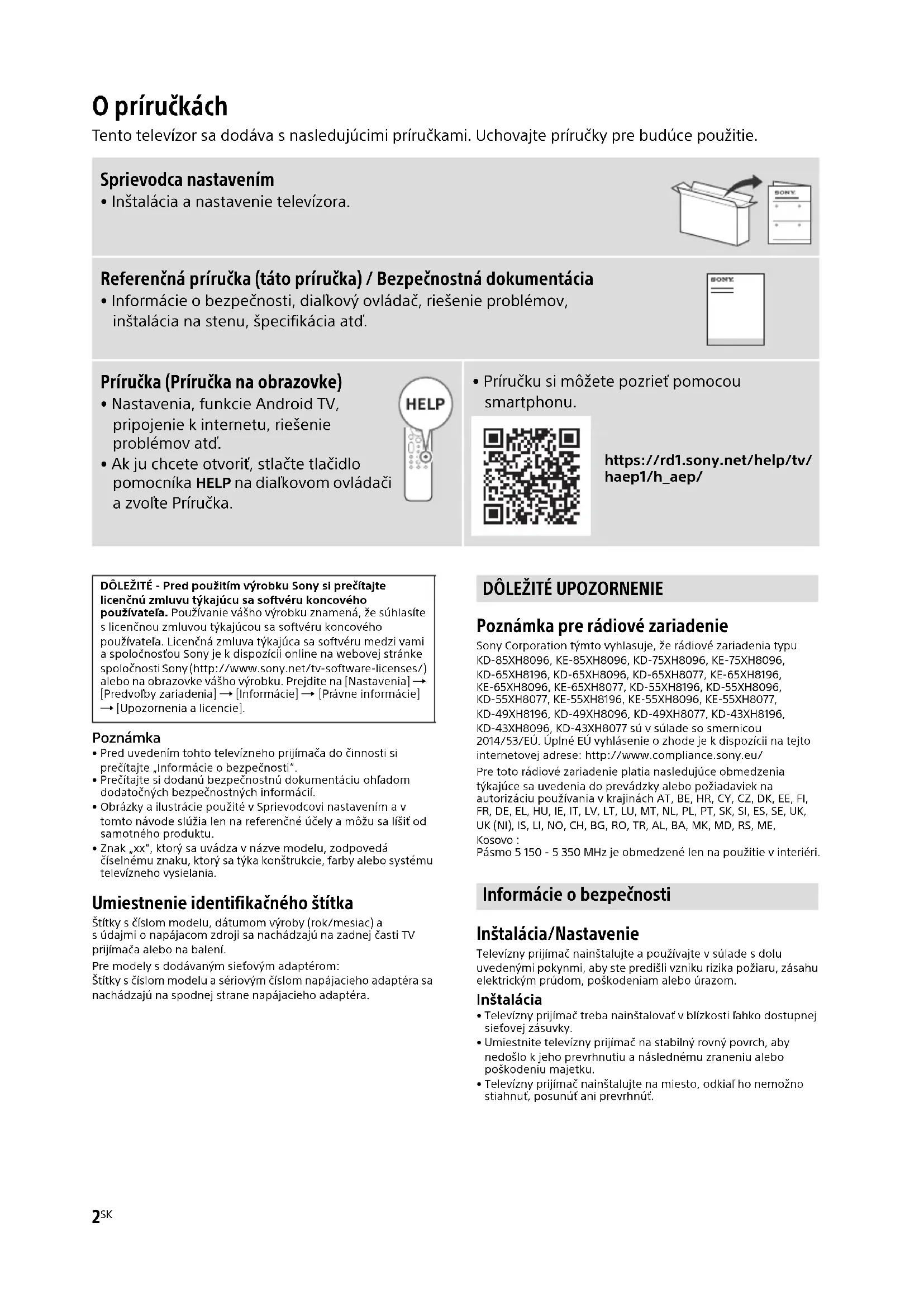 - Príručku si môžete pozrieť pomocou smartphonu. https://rd1.sony.net/help/tv/ haep1/h_aep/ DÔLEŽITÉ - Pred použitím výrobku Sony si prečítajte licenčnú zmluvu týkajúcu sa softvéru koncového používateľa. Používanie vášho výrobku znamená, že súhlasíte s licenčnou zmluvou týkajúcou sa softvéru koncového používateľa. Licenčná zmluva týkajúca sa softvéru medzi vami a spoločnosťou Sony je k dispozícii online na webovej stránke spoločnosti Sony (http://www.sony.net/tv-software-licenses/) alebo na obrazovke vášho výrobku. Prejdite na [Nastavenia] [Predvoľby zariadenia] [Informácie] [Právne informácie] [Upozornenia a licencie].