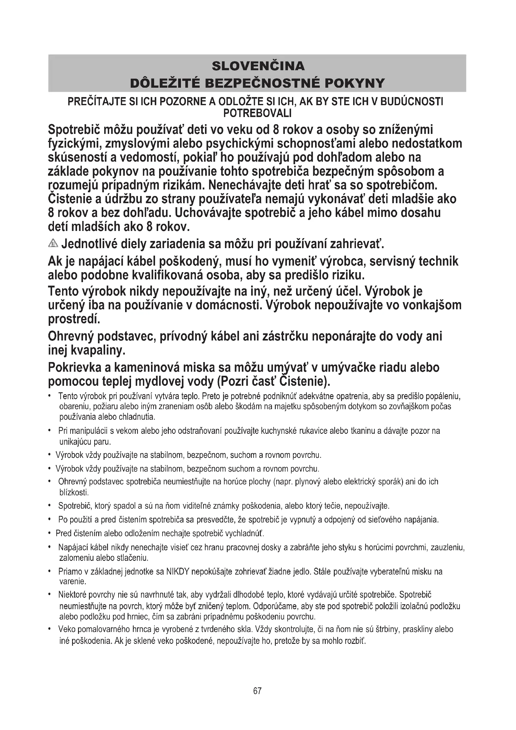 PREČÍTAJTE SI ICH POZORNE A ODLOŽTE SI ICH, AK BY STE ICH V BUDÚCNOSTI POTREBOVALI Spotrebič môžu používať deti vo veku od 8 rokov a osoby so zníženými fyzickými, zmyslovými alebo psychickými schopnosťami alebo nedostatkom skúseností a vedomostí, pokiaľ ho používajú pod dohľadom alebo na základe pokynov na používanie tohto spotrebiča bezpečným spôsobom a rozumejú prípadným rizikám. Nenechávajte deti hrať sa so spotrebičom. Čistenie a údržbu zo strany používateľa nemajú vykonávať deti mladšie ako 8 rokov a bez dohľadu. Uchovávajte spotrebič a jeho kábel mimo dosahu detí mladších ako 8 rokov. Jednotlivé diely zariadenia sa môžu pri používaní zahrievať. Ak je napájací kábel poškodený, musí ho vymeniť výrobca, servisný technik alebo podobne kvalifikovaná osoba, aby sa predišlo riziku. Tento výrobok nikdy nepoužívajte na iný, než určený účel. Výrobok je určený iba na používanie v domácnosti. Výrobok nepoužívajte vo vonkajšom prostredí. Ohrevný podstavec, prívodný kábel ani zástrčku neponárajte do vody ani inej kvapaliny. Pokrievka a kameninová miska sa môžu umývať v umývačke riadu alebo pomocou teplej mydlovej vody (Pozri časť Čistenie).