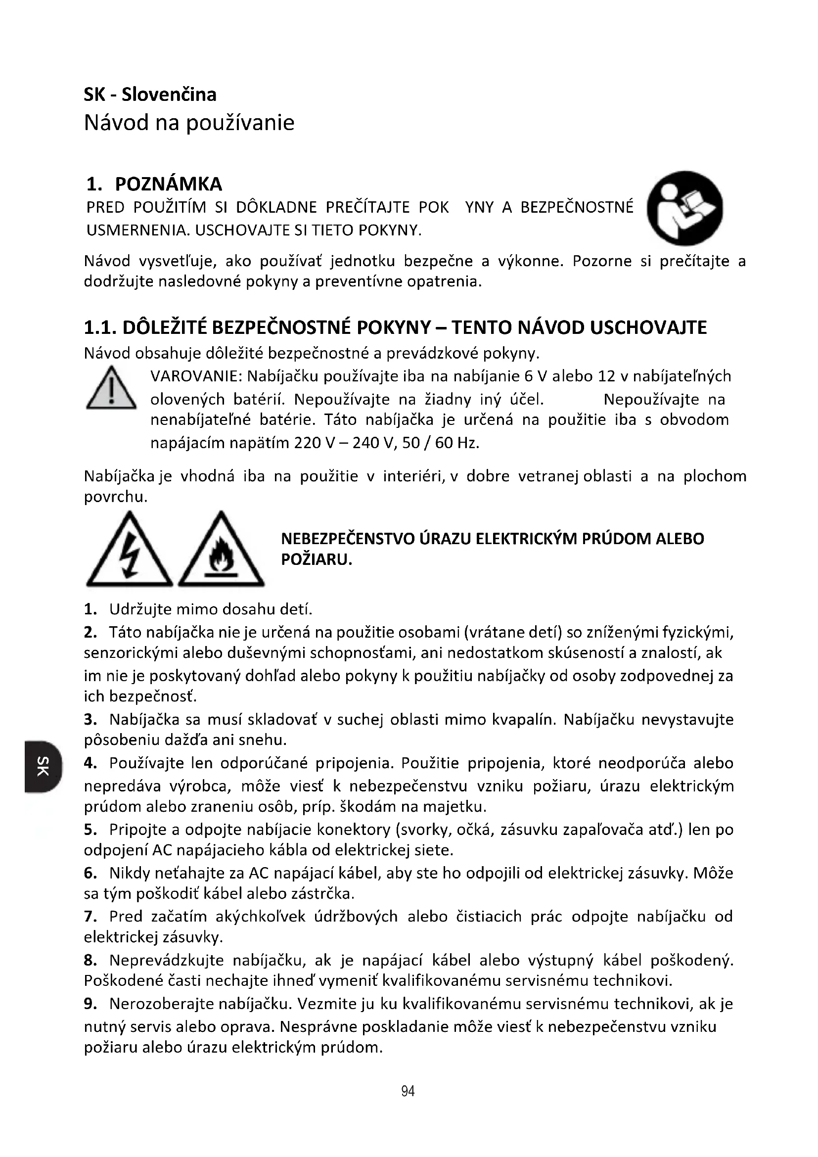 Návod vysvetľuje, ako používať jednotku bezpečne a výkonne. Pozorne si prečítajte a dodržujte nasledovné pokyny a preventívne opatrenia. 1.1. DÔLEŽITÉ BEZPEČNOSTNÉ POKYNY – TENTO NÁVOD USCHOVAJTE Návod obsahuje dôležité bezpečnostné a prevádzkové pokyny. VAROVANIE: Nabíjačku používajte iba na nabíjanie 6 V alebo 12 v nabíjateľných olovených batérií. Nepoužívajte na žiadny iný účel. Nepoužívajte na nenabíjateľné batérie. Táto nabíjačka je určená na použitie iba s obvodom s napájacím napätím 220 V – 240 V, 50 / 60 Hz.