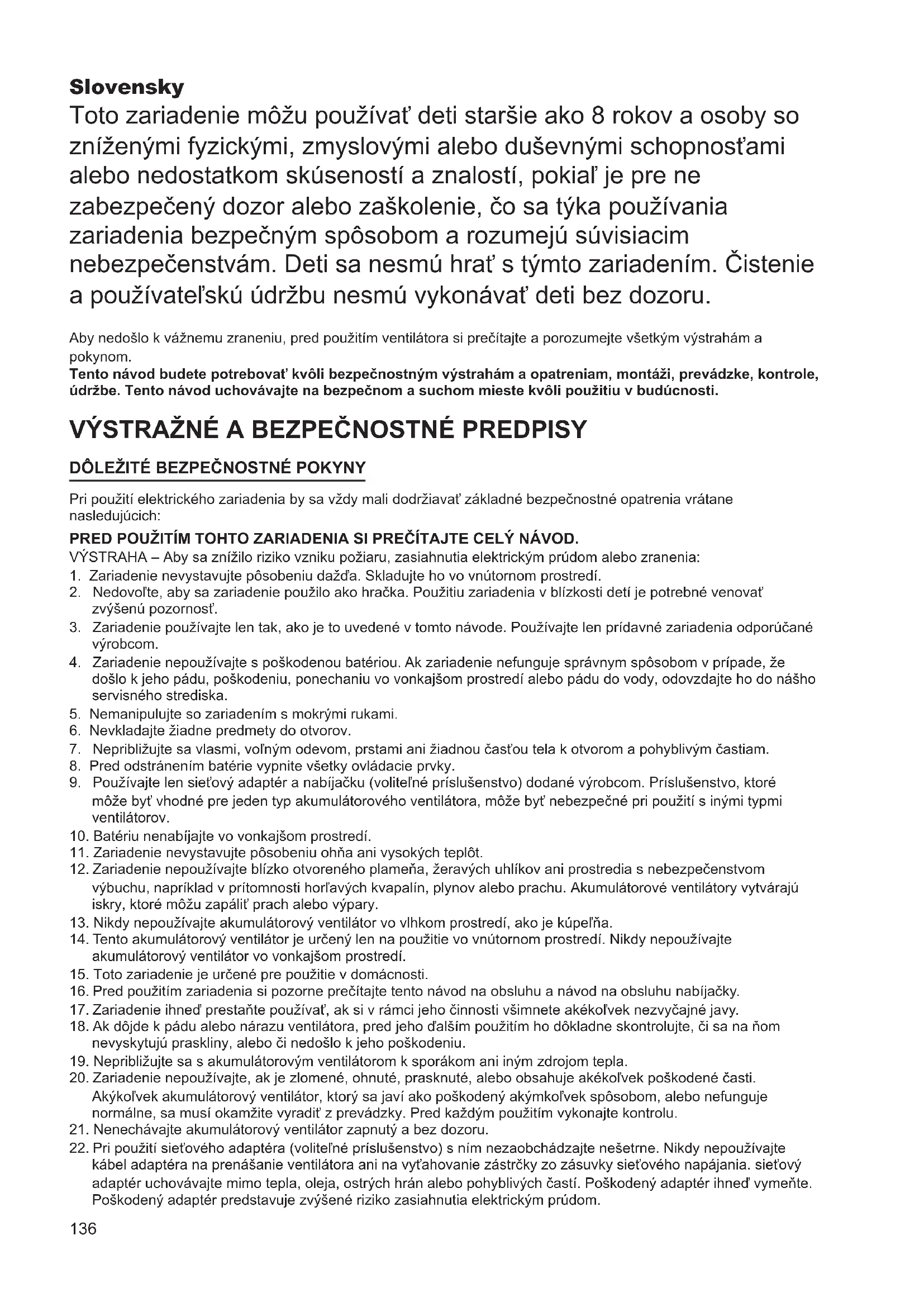 3. Akumulátorový ventilátor, ktorý sa nepoužíva, skladujte mimo dosahu detí a ostatných nezaškolených osôb.