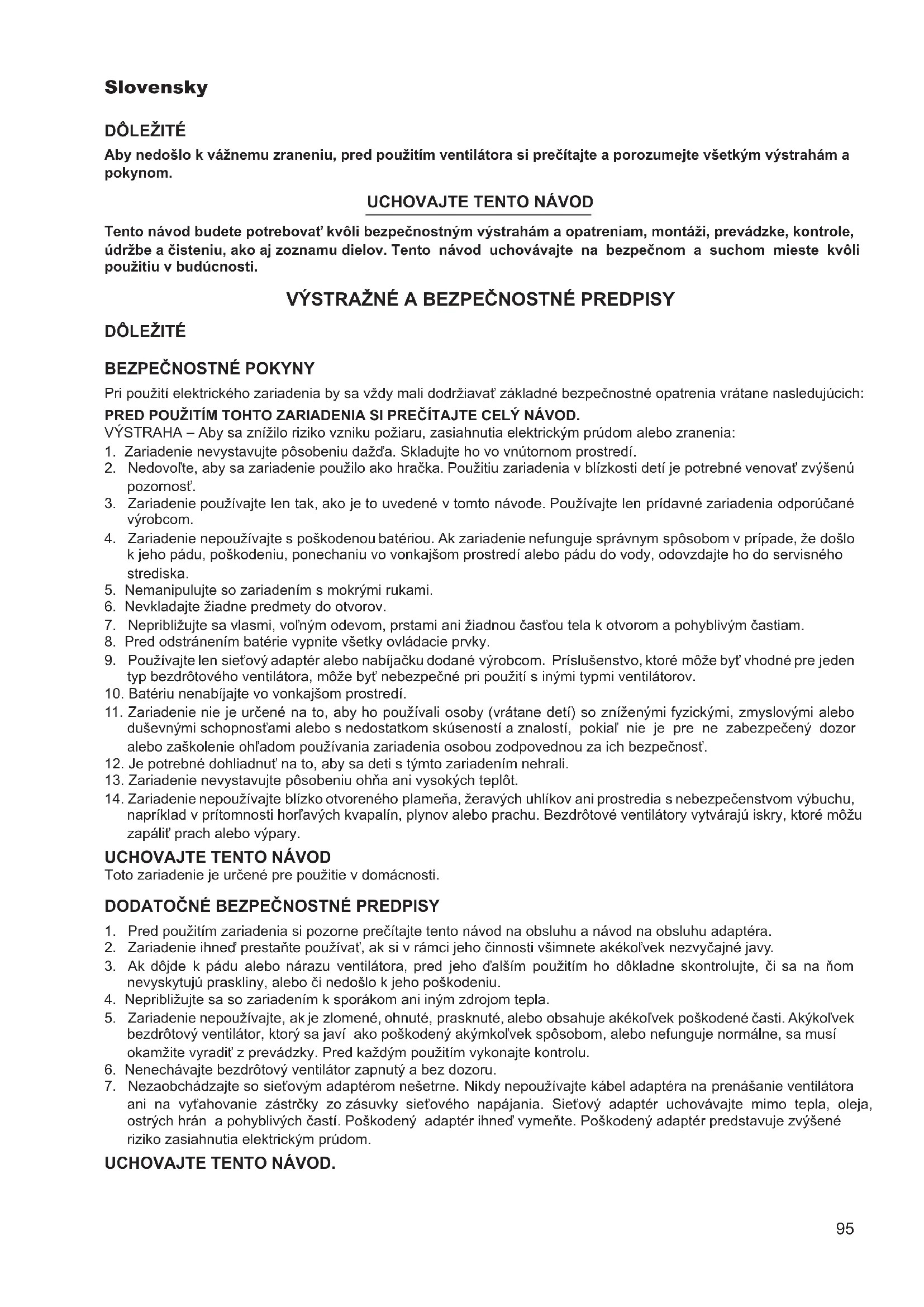 Tento návod budete potrebovať kvôli bezpečnostným výstrahám a opatreniam, montáži, prevádzke, kontrole, údržbe a čisteniu, ako aj zoznamu dielov. Tento návod uchovávajte na bezpečnom a suchom mieste kvôli použitiu v budúcnosti. VÝSTRAŽNÉ A BEZPEČNOSTNÉ PREDPISY