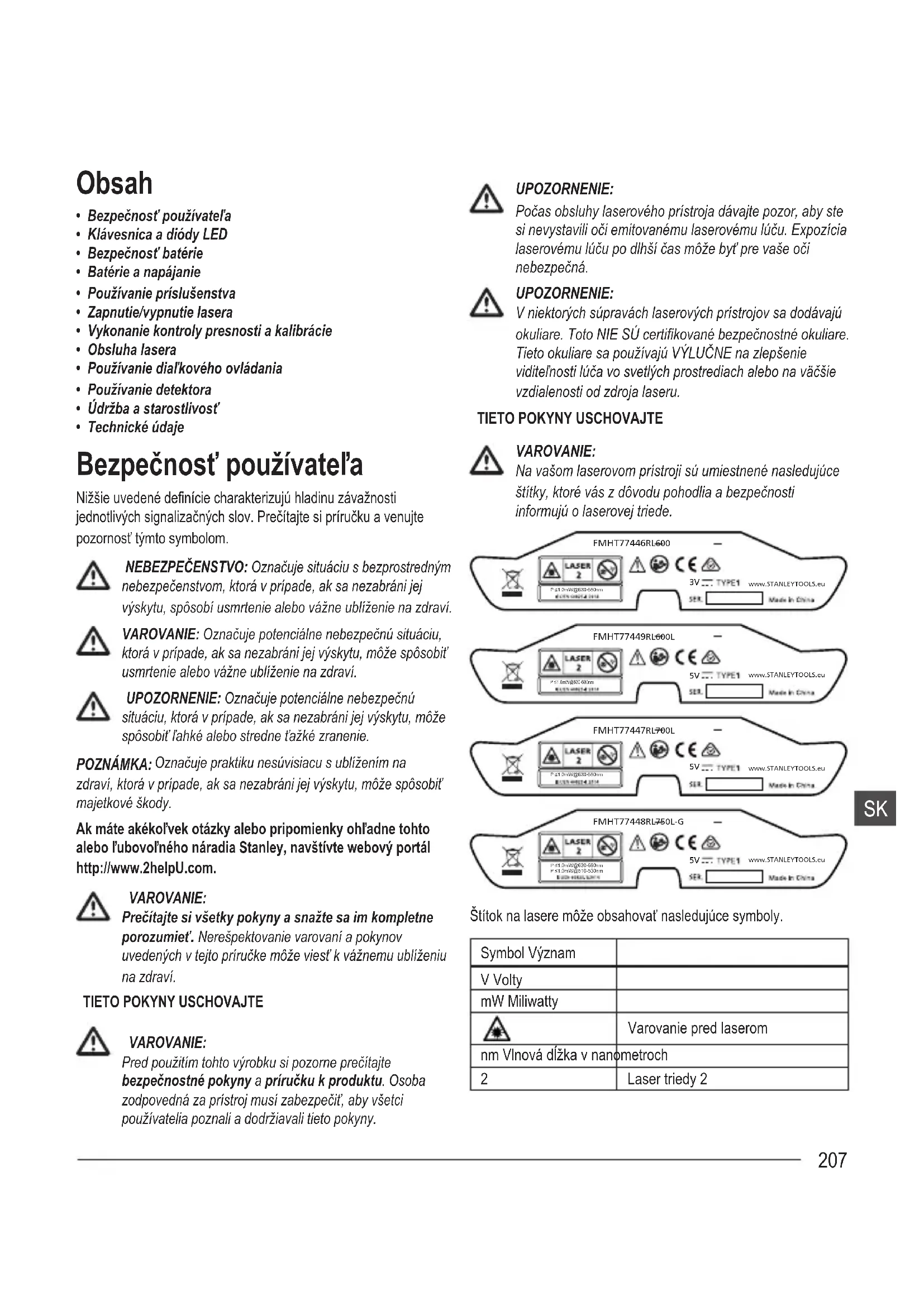www.STANLEYTOOLS.euP ≤1.0mW@630-680nmP ≤1.0mW@510-530nm Štítok na lasere môže obsahovať nasledujúce symboly. Symbol Význam V Volty mW Miliwatty Varovanie pred laserom nm Vlnová dĺžka v nanometroch 2 Laser triedy 2208