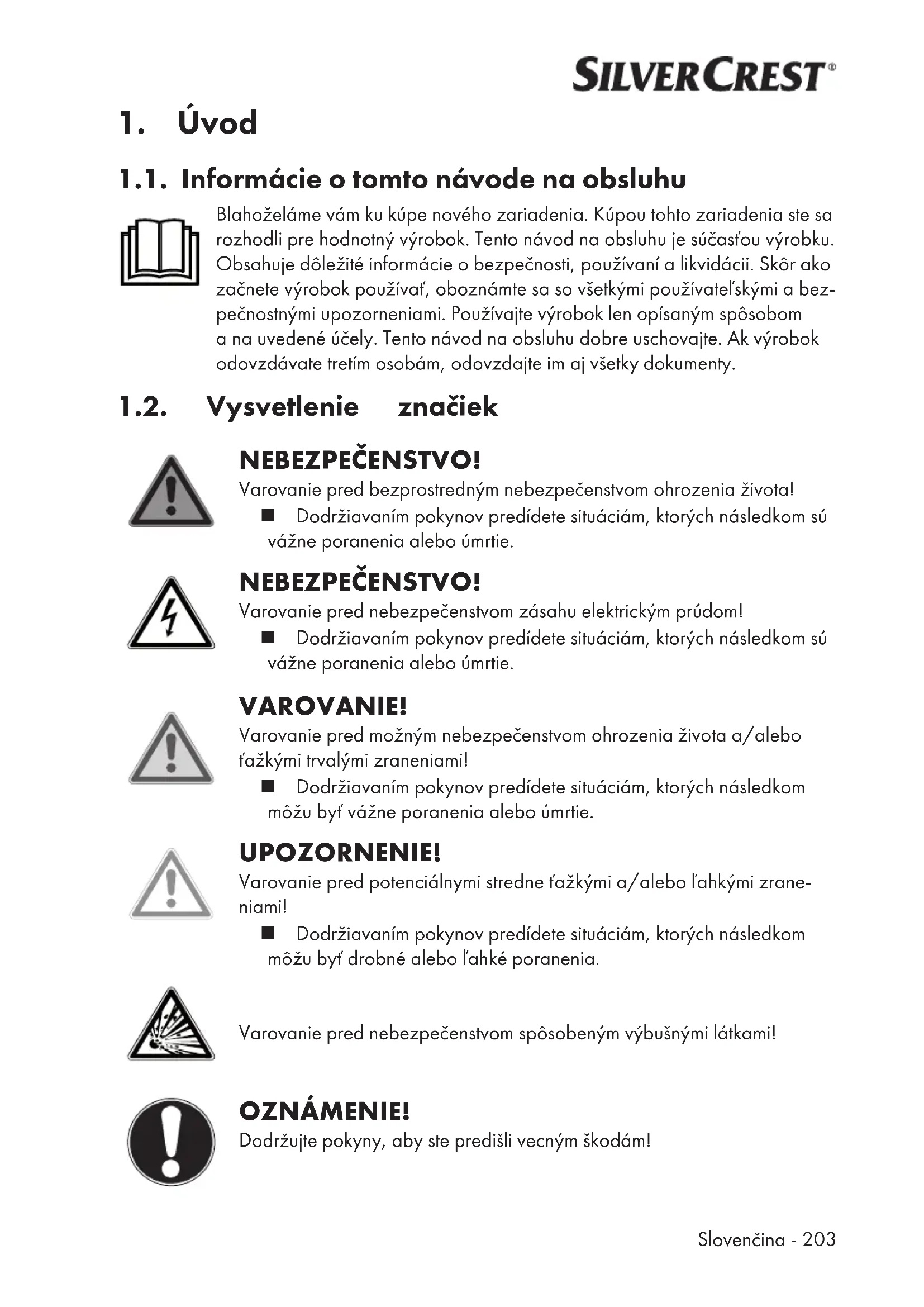 1.1. Informácie otomto návode na obsluhu Blahoželáme vám ku kúpe nového zariadenia. Kúpou tohto zariadenia ste sa rozhodli pre hodnotný výrobok. Tento návod na obsluhu je súčasťou výrobku. Obsahuje dôležité informácie obezpečnosti, používaní alikvidácii. Skôr ako začnete výrobok používať, oboznámte sa so všetkými používateľskými abez- pečnostnými upozorneniami. Používajte výrobok len opísaným spôsobom ana uvedené účely. Tento návod na obsluhu dobre uschovajte. Ak výrobok odovzdávate tretím osobám, odovzdajte im aj všetky dokumenty. 1.2. Vysvetlenie značiek NEBEZPEČENSTVO! Varovanie pred bezprostredným nebezpečenstvom ohrozenia života! Dodržiavaním pokynov predídete situáciám, ktorých následkom sú vážne poranenia alebo úmrtie. NEBEZPEČENSTVO! Varovanie pred nebezpečenstvom zásahu elektrickým prúdom! Dodržiavaním pokynov predídete situáciám, ktorých následkom sú vážne poranenia alebo úmrtie. VAROVANIE! Varovanie pred možným nebezpečenstvom ohrozenia života a/alebo ťažkými trvalými zraneniami! Dodržiavaním pokynov predídete situáciám, ktorých následkom môžu byť vážne poranenia alebo úmrtie. UPOZORNENIE! Varovanie pred potenciálnymi stredne ťažkými a/alebo ľahkými zrane- niami! Dodržiavaním pokynov predídete situáciám, ktorých následkom môžu byť drobné alebo ľahké poranenia. Varovanie pred nebezpečenstvom spôsobeným výbušnými látkami! OZNÁMENIE! Dodržujte pokyny, aby ste predišli vecným škodám!204 - Slovenčina Podrobné informácie opoužívaní zariadenia! Dodržujte pokyny uvedené vnávode na obsluhu!