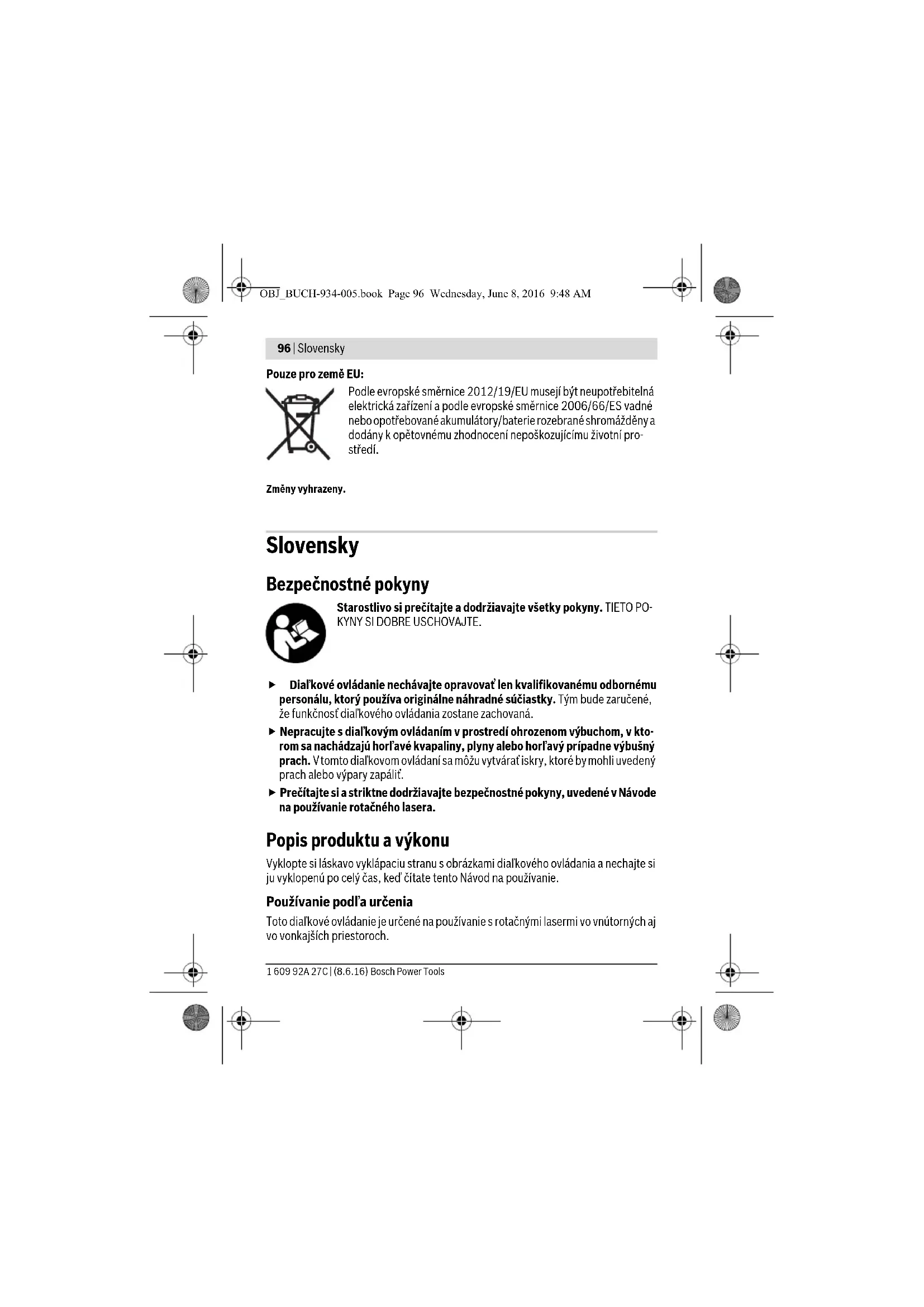 Na jednoznačnú identifikáciu Vášho diaľkového ovládania slúži sériové číslo 10 na typovom štítku. OBJ_BUCH-934-005.book Page 97 Wednesday, June 8, 2016 9:48 AM98 | Slovensky 1 609 92A 27C | (8.6.16) Bosch Power Tools kladnej výbavy prístroja. Dávajte pritom pozor na správne pólovanie podľa vyobraze- nia v priehradke na batérie. Keď diaľkové ovládanie dlhší čas nepoužívate, vyberte z neho batériu. Počas dlhšieho skladovania by mohla batéria korodovať alebo by sa mohla samočinne vy- bíjať. Používanie Uvedenie do prevádzky Chráňte diaľkové ovládanie pred vlhkom a pred priamym slnečným žiarením. Nevystavujte diaľkové ovládanie extrémnym teplotám ani kolísaniu teplôt. Nenechávajte ho odložené dlhší čas napr. v motorovom vozidle. V prípade väčšie- ho rozdielu teplôt nechajte najprv diaľkové ovládanie pred jeho použitím tempero- vať na teplotu prostredia, v ktorom ho budete používať. Kým je vložená batéria s dostatočným napätím, zostáva diaľkové ovládanie schopné prevádzky. Rotačný laser inštalujte tak, aby signály diaľkového ovládania dosahovali v priamom smere jednu z prijímacích šošoviek na rotačnom laseri (pozri k tomu Návod na použí- vanie rotačného lasera) Keď nemôže diaľkové ovládanie smerovať priamo na niektorú prijímaciu šošovku, pracovný dosah sa zmenší. Pomocou odrazov signálu (napr. od stien) sa môže dosah aj pri nepriamom signále opäť zlepšiť. Po stlačení niektorého tlačidla diaľkového ovládania sa rozsvieti indikácia režimu pre- vádzky 6, čo znamená, že signál bol vyslaný. Zapínanie a vypínanie rotačného lasera pomocou diaľkového ovládania nie je možné. Druhy prevádzky Podrobné informácie k fungovaniu rotačného lasera nájdete v Návode na používanie rotačného lasera. Rotačná prevádzka (150/300/600 min