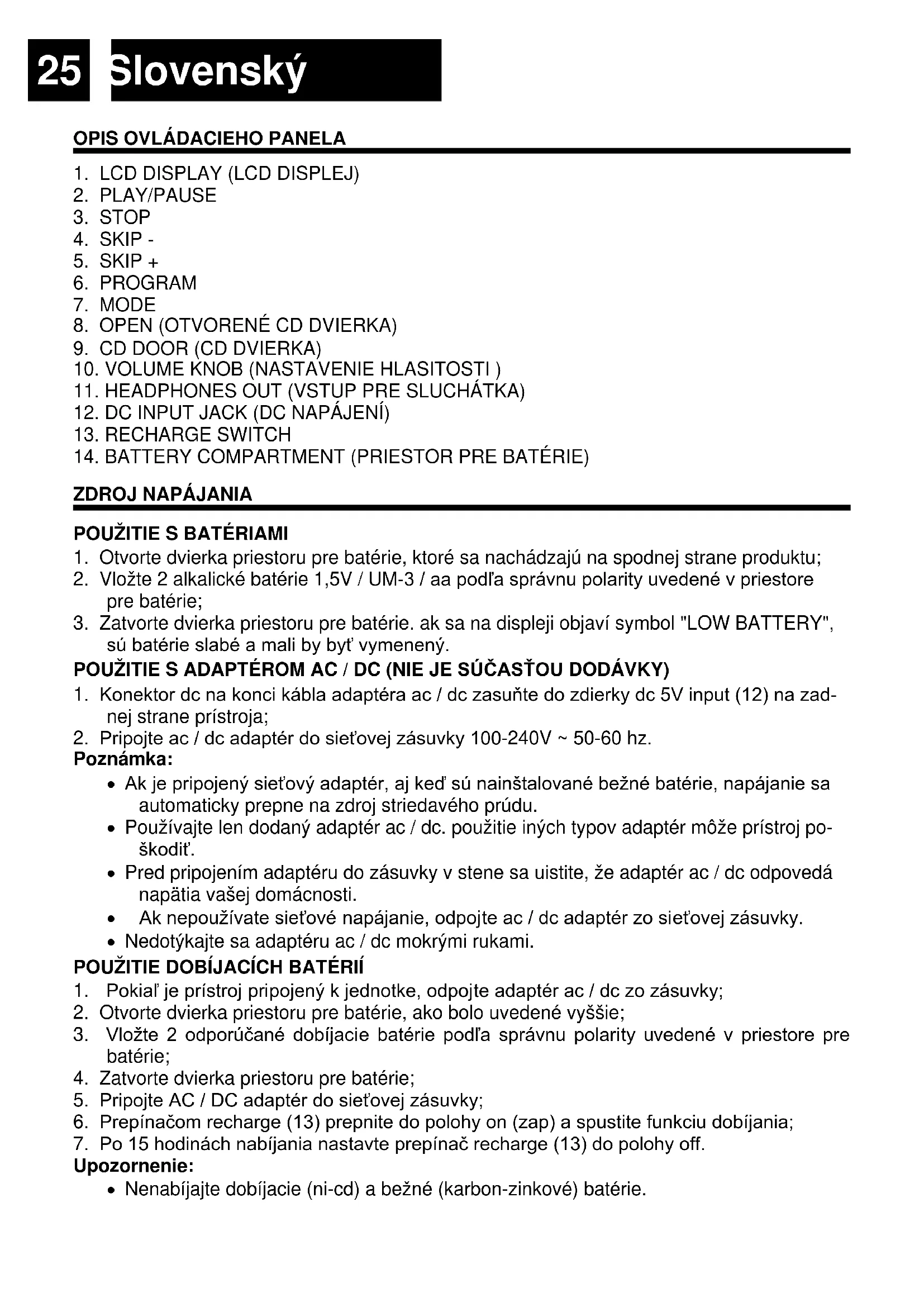 Poznámka: Ak je pripojený sieťový adaptér, aj keď sú nainštalované bežné batérie, napájanie sa automaticky prepne na zdroj striedavého prúdu. Používajte len dodaný adaptér ac / dc. použitie iných typov adaptér môže prístroj po- škodiť. Pred pripojením adaptéru do zásuvky v stene sa uistite, že adaptér ac / dc odpovedá napätia vašej domácnosti. Ak nepoužívate sieťové napájanie, odpojte ac / dc adaptér zo sieťovej zásuvky. Nedotýkajte sa adaptéru ac / dc mokrými rukami. POUŽITIE DOBÍJACÍCH BATÉRIÍ