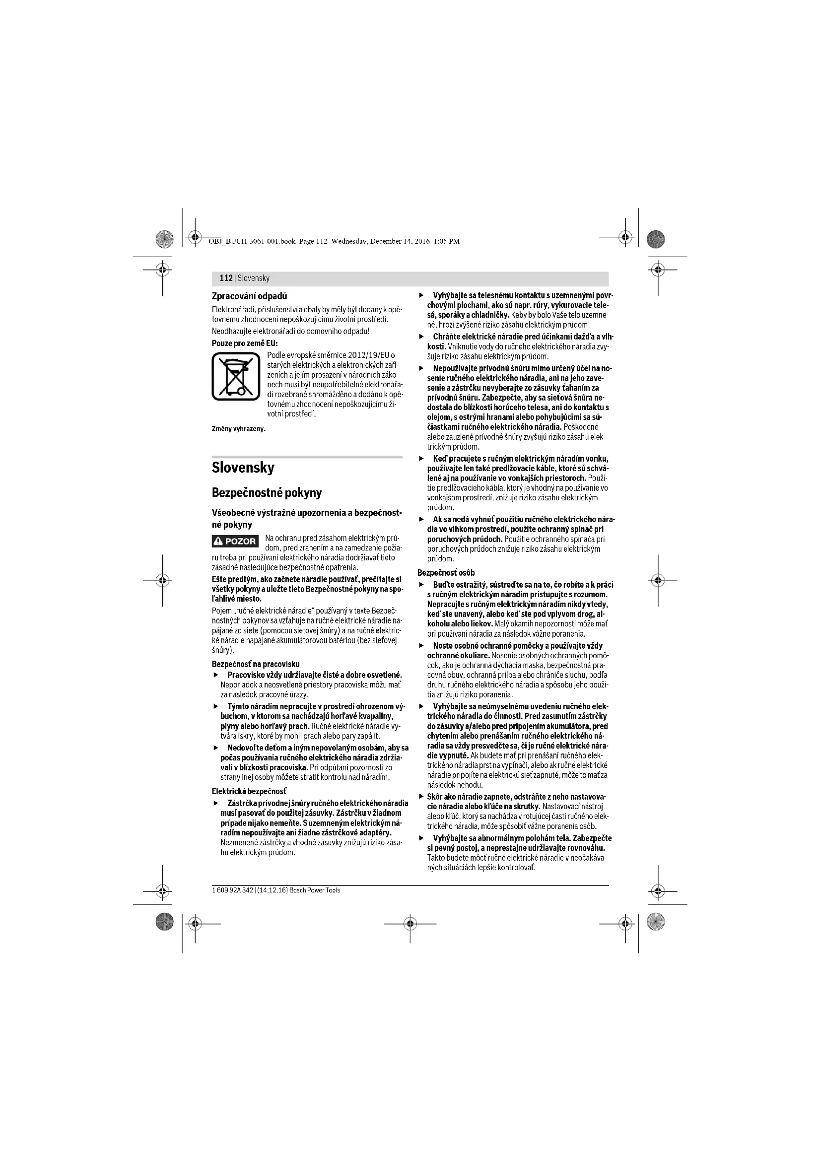 Skôr ako náradie zapnete, odstráňte z neho nastavova- cie náradie alebo kľúče na skrutky. Nastavovací nástroj alebo kľúč, ktorý sa nachádza v rotujúcej časti ručného elek- trického náradia, môže spôsobiť vážne poranenia osôb. Vyhýbajte sa abnormálnym polohám tela. Zabezpečte si pevný postoj, a neprestajne udržiavajte rovnováhu. Takto budete môcť ručné elektrické náradie v neočakáva- ných situáciách lepšie kontrolovať. OBJ_BUCH-3061-001.book Page 112 Wednesday, December 14, 2016 1:05 PMSlovensky | 113 Bosch Power Tools 1 609 92A 342 | (14.12.16) Pri práci noste vhodný pracovný odev. Nenoste široké odevy a nemajte na sebe šperky. Vyvarujte sa toho, aby sa Vaše vlasy, odev a rukavice dostali do blízkosti rotu- júcich súčiastok náradia. Voľný odev, dlhé vlasy alebo šperky môžu byť zachytené rotujúcimi časťami ručného elektrického náradia. Ak sa dá na ručné elektrické náradie namontovať odsá- vacie zariadenie a zariadenie na zachytávanie prachu, presvedčte sa, či sú dobre pripojené a správne použí- vané. Používanie odsávacieho zariadenia a zariadenia na zachytávanie prachu znižuje riziko ohrozenia zdravia pra- chom. Starostlivé používanie ručného elektrického náradia a manipulácia s ním Ručné elektrické náradie nikdy nepreťažujte. Používaj- te také elektrické náradie, ktoré je určené pre daný druh práce. Pomocou vhodného ručného elektrického ná- radia budete pracovať lepšie a bezpečnejšie v uvedenom rozsahu výkonu náradia. Nepoužívajte nikdy také ručné elektrické náradie, kto- ré má pokazený vypínač. Náradie, ktoré sa už nedá zap- núť alebo vypnúť, je nebezpečné a treba ho zveriť do opra- vy odborníkovi. Skôr ako začnete náradie nastavovať alebo prestavo- vať, vymieňať príslušenstvo alebo skôr, ako odložíte náradie, vždy vytiahnite zástrčku sieťovej šnúry zo zá- suvky. Toto preventívne opatrenie zabraňuje neúmyselné- mu spusteniu ručného elektrického náradia. Nepoužívané ručné elektrické náradie uschovávajte tak, aby bolo mimo dosahu detí. Nedovoľte používať to- to náradie osobám, ktoré s ním nie sú dôverne obozná- mené, alebo ktoré si neprečítali tieto Pokyny. Ručné elektrické náradie je nebezpečné vtedy, keď ho používajú neskúsené osoby. Ručné elektrické náradie starostlivo ošetrujte. Kontro- lujte, či pohyblivé súčiastky bezchybne fungujú alebo či neblokujú, či nie sú zlomené alebo poškodené niekto- ré súčiastky, ktoré by mohli negatívne ovplyvňovať správne fungovanie ručného elektrického náradia. Pred použitím náradia dajte poškodené súčiastky vy- meniť. Veľa nehôd bolo spôsobených nedostatočnou údržbou elektrického náradia. Rezné nástroje udržiavajte ostré a čisté. Starostlivo ošetrované rezné nástroje s ostrými reznými hranami majú menšiu tendenciu k zablokovaniu a ľahšie sa dajú viesť. Používajte ručné elektrické náradie, príslušenstvo, na- stavovacie nástroje a pod. podľa týchto výstražných upozornení a bezpečnostných pokynov. Pri práci zoh- ľadnite konkrétne pracovné podmienky a činnosť, kto- rú budete vykonávať. Používanie ručného elektrického náradia na iný účel ako na predpísané použitie môže viesť k nebezpečným situáciám. Servisné práce Ručné elektrické náradie dávajte opravovať len kvalifi- kovanému personálu, ktorý používa originálne náhrad- né súčiastky. Tým sa zabezpečí, že bezpečnosť náradia zostane zachovaná. Bezpečnostné pokyny pre rezacie brúsky Nikdy sa na ručné elektrické náradie nestavajte. Mohli by ste sa vážne poraniť, ak by sa ručné elektrické náradie prevrátilo, alebo ak by ste sa dostali do náhodného kontak- tu s rezacím kotúčom. Pracujte vždy iba s ochranným krytom. Ochranný kryt chráni používateľa a iné osoby pred odlomenými časťami rezacieho kotúča a pred neúmyselným dotykom rezacieho kotúča. Zabezpečte, aby ochranný kryt správne fungoval a dal sa voľne pohybovať. Nikdy neblokujte ochranný kryt ná- radia v otvorenom stave. Používajte toto ručné elektrické náradie len na rezanie nasucho. Vniknutie vody do ručného elektrického náradia zvyšuje riziko možného zásahu elektrickým prúdom. Zabezpečte, aby sa prívodná šnúra nenachádzala v blíz- kosti rotujúcich pracovných nástrojov náradia. Sieťová šnúra by sa mohla prerezať, alebo by ju mohlo zachytiť. Rukoväte udržiavajte suché a čisté a postarajte sa o to, aby na nich nebol olej ani tuk. Mastné, zaolejované ruko- väte sú šmykľavé a spôsobujú stratu kontroly nad náradím. Nikdy neodstraňujte zvyšky rezaného materiálu, kovo- vé piliny a pod. z priestoru rezu vtedy, keď ručné elek- trické náradie ešte beží. Rameno náradia dajte najprv do pokojovej polohy a potom ručné elektrické náradie vypni- te. Rezací kotúč prisúvajte k obrobku iba vtedy, keď je ná- radie v zapnutom stave. Inak hrozí nebezpečenstvo spät- ného rázu v prípade, ak by sa pracovný nástroj v obrobku zasekol. Ručné elektrické náradie používajte len vtedy, keď sa na pracovnej ploche nenachádzajú žiadne nastavova- cie nástroje, kovové triesky a pod. a je voľná až po ob- robok, ktorý budete obrábať. Drobné kovové kúsky ale- bo iné predmety sa môžu dostať do kontaktu s rotujúcim rezacím kotúčom a môžu vysokou rýchlosťou zasiahnuť ob- sluhujúcu osobu. Obrobok, ktorý budete obrábať, vždy spoľahlivo upni- te. Neobrábajte žiadne také obrobky, ktoré sú príliš malé na to, aby ste ich mohli upnúť. Vzdialenosť Vašej ru- ky k rotujúcemu rezaciemu kotúču by potom bola potom príliš malá. Ak sa rezací kotúč v obrobku vzpriečuje alebo blokuje, ručné elektrické náradie vypnite a počkajte, kým sa re- zací kotúč úplne zastaví. Nepokú
