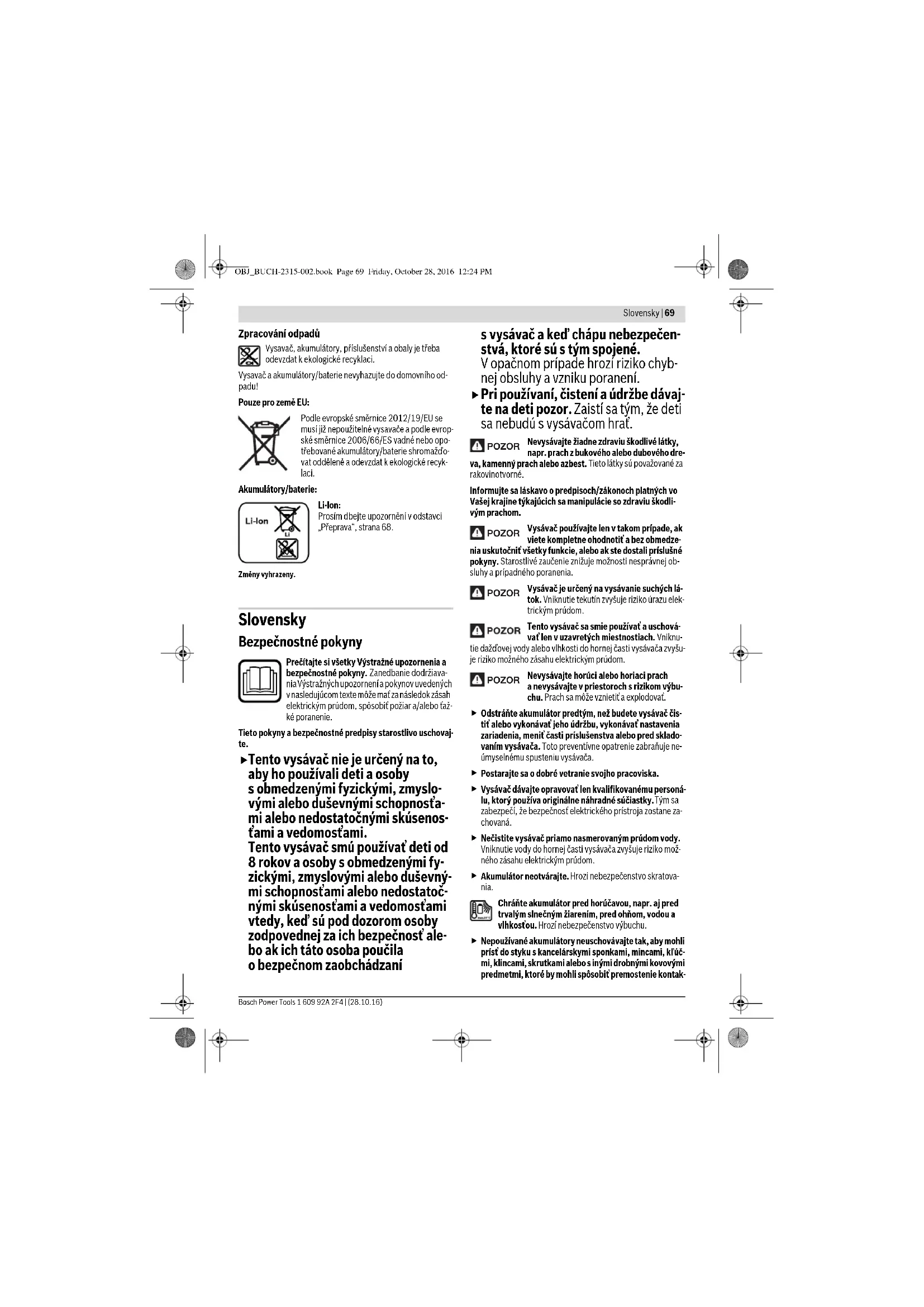 Pri používaní, čistení a údržbe dávaj- te na deti pozor. Zaistí sa tým, že deti sa nebudú s vysávačom hrať. Nevysávajte žiadne zdraviu škodlivé látky, napr. prach z bukového alebo dubového dre-va, kamenný prach alebo azbest. Tieto látky sú považované za rakovinotvorné.Informujte sa láskavo o predpisoch/zákonoch platných vo Vašej krajine týkajúcich sa manipulácie so zdraviu škodli-vým prachom.Vysávač používajte len v takom prípade, ak viete kompletne ohodnotiť a bez obmedze-nia uskutočniť všetky funkcie, alebo ak ste dostali príslušné pokyny. Starostlivé zaučenie znižuje možnosti nesprávnej ob-sluhy a prípadného poranenia.Vysávač je určený na vysávanie suchých lá-tok. Vniknutie tekutín zvyšuje riziko úrazu elek-trickým prúdom.Tento vysávač sa smie používať a uschová-vať len v uzavretých miestnostiach. Vniknu-tie dažďovej vody alebo vlhkosti do hornej časti vysávača zvyšu-je riziko možného zásahu elektrickým prúdom.Nevysávajte horúci alebo horiaci prach a nevysávajte v priestoroch s rizikom výbu-chu. Prach sa môže vznietiť a explodovať. Odstráňte akumulátor predtým, než budete vysávač čis-tiť alebo vykonávať jeho údržbu, vykonávať nastavenia zariadenia, meniť časti príslušenstva alebo pred sklado-vaním vysávača. Toto preventívne opatrenie zabraňuje ne-úmyselnému spusteniu vysávača. Postarajte sa o dobré vetranie svojho pracoviska. Vysávač dávajte opravovať len kvalifikovanému personá-lu, ktorý používa originálne náhradné súčiastky. Tým sa zabezpečí, že bezpečnosť elektrického prístroja zostane za-chovaná. Nečistite vysávač priamo nasmerovaným prúdom vody. Vniknutie vody do hornej časti vysávača zvyšuje riziko mož-ného zásahu elektrickým prúdom. Akumulátor neotvárajte. Hrozí nebezpečenstvo skratova- nia. Chráňte akumulátor pred horúčavou, napr. aj pred trvalým slnečným žiarením, pred ohňom, vodou a vlhkosťou. Hrozí nebezpečenstvo výbuchu. Nepoužívané akumulátory neuschovávajte tak, aby mohli prísť do styku s kancelárskymi sponkami, mincami, kľúč-mi, klincami, skrutkami alebo s inými drobnými kovovými predmetmi, ktoré by mohli spôsobiť premostenie kontak- POZOR POZOR POZOR POZOR OBJ_BUCH-2315-002.book Page 69 Friday, October 28, 2016 12:24 PM70 | Slovensky 1 609 92A 2F4 | (28.10.16) Bosch Power Tools tov. Skrat medzi kontaktmi akumulátora môže mať za násle- dok popálenie alebo môže spôsobiť vznik požiaru.