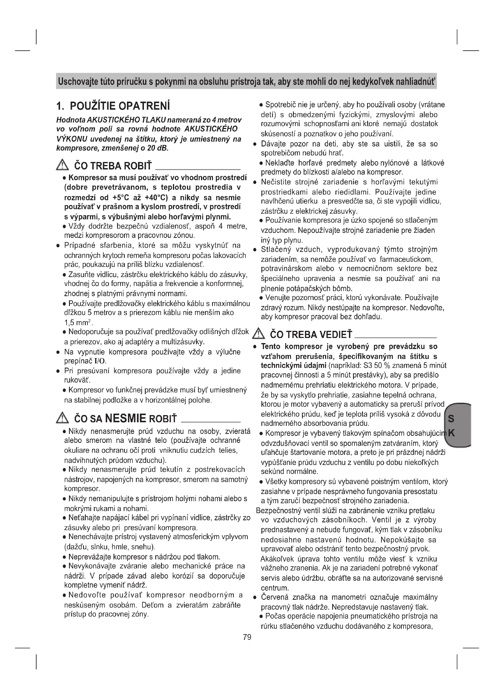 ● Nikdy nenasmerujte prúd vzduchu na osoby, zvieratá alebo smerom na vlastné telo (používajte ochranné okuliare na ochranu očí proti vniknutiu cudzích telies, nadvihnutých prúdom vzduchu). ● Nikdy nenasmerujte prúd tekutín z postrekovacích nástrojov, napojených na kompresor, smerom na samotný kompresor. ● Nikdy nemanipulujte s prístrojom holými nohami alebo s mokrými rukami a nohami. ● Neťahajte napájací kábel pri vypínaní vidlice, zástrčky zo zásuvky alebo pri presúvaní kompresora. ● Nenechávajte prístroj vystavený atmosferickým vplyvom (dažďu, slnku, hmle, snehu). ● Neprevážajte kompresor s nádržou pod tlakom. ● Nevykonávajte zváranie alebo mechanické práce na nádrži. V prípade závad alebo korózií sa doporučuje kompletne vymeniť nádrž. ● Nedovoľte používať kompresor neodborným a neskúseným osobám. Deťom a zvieratám zabráňte prístup do pracovnej zóny. ● Spotrebič nie je určený, aby ho používali osoby (vrátane detí) s obmedzenými fyzickými, zmyslovými alebo rozumovými schopnosťami ani ktoré nemajú dostatok skúseností a poznatkov o jeho používaní. ● Dávajte pozor na deti, aby ste sa uistili, že sa so spotrebičom nebudú hrať. ● Neklaďte horľavé predmety alebo nylónové a látkové predmety do blízkosti a/alebo na kompresor. ● Nečistite strojné zariadenie s horľavými tekutými prostriedkami alebo riedidlami. Používajte jedine navlhčenú utierku a presvedčte sa, či ste vypojili vidlicu, zástrčku z elektrickej zásuvky. ● Používanie kompresora je úzko spojené so stlačeným vzduchom. Nepoužívajte strojné zariadenie pre žiaden iný typ plynu. ● Stlačený vzduch, vyprodukovaný týmto strojným zariadením, sa nemôže používať vo farmaceutickom, potravinárskom alebo v nemocničnom sektore bez špeciálneho upravenia a nesmie sa používať ani na plnenie potápačských bômb. ● Venujte pozornosť práci, ktorú vykonávate. Používajte zdravý rozum. Nikdy nestúpajte na kompresor. Nedovoľte, aby kompresor pracoval bez dohľadu.