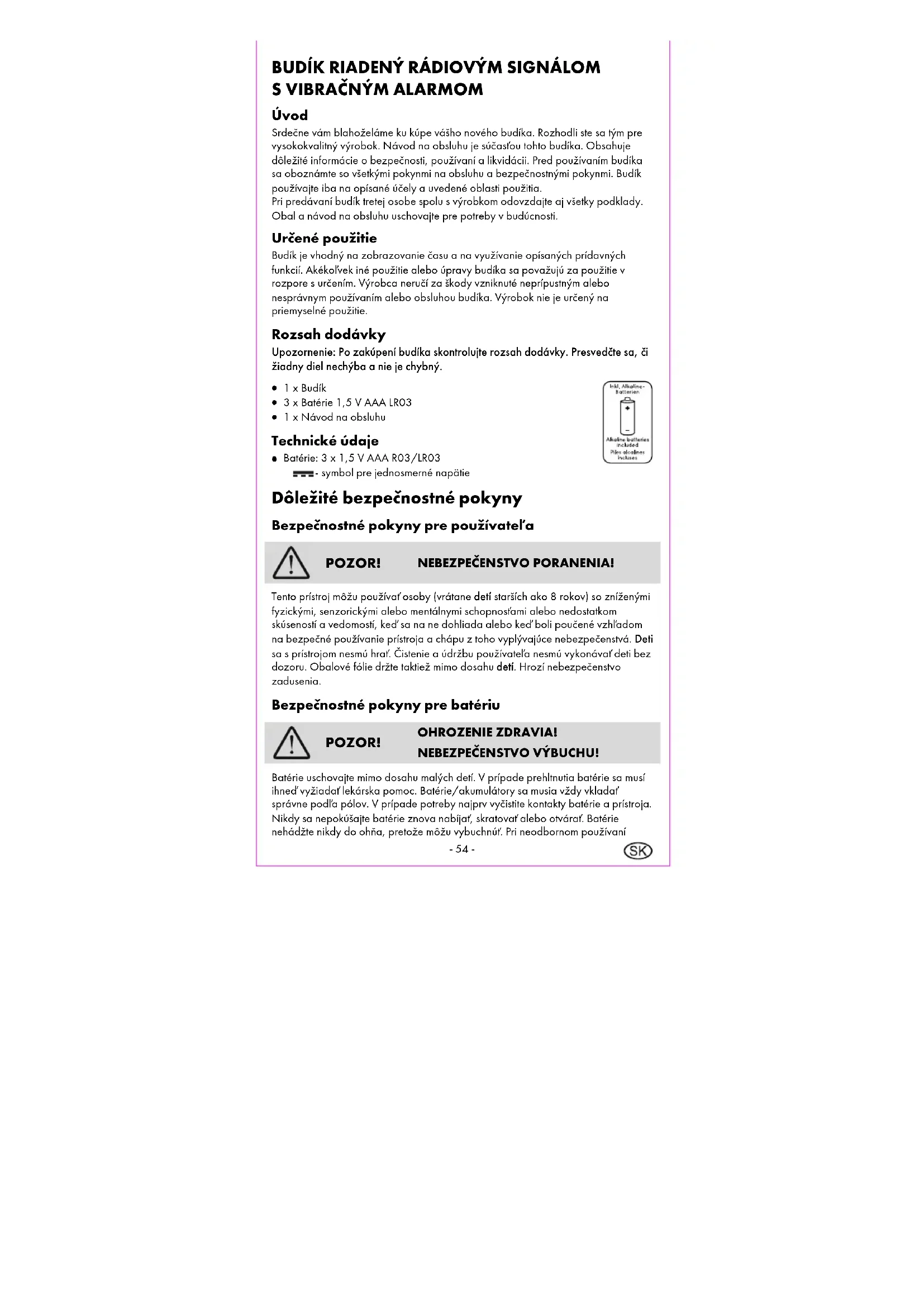 POZOR! OHROZENIE ZDRAVIA! NEBEZPEČENSTVO VÝBUCHU! Batérie uschovajte mimo dosahu malých detí. V prípade prehltnutia batérie sa musí ihneď vyžiadať lekárska pomoc. Batérie/akumulátory sa musia vždy vkladať správne podľa pólov. V prípade potreby najprv vyčistite kontakty batérie a prístroja. Nikdy sa nepokúšajte batérie znova nabíjať, skratovať alebo otvárať. Batérie nehádžte nikdy do ohňa, pretože môžu vybuchnúť. Pri neodbornom používaní