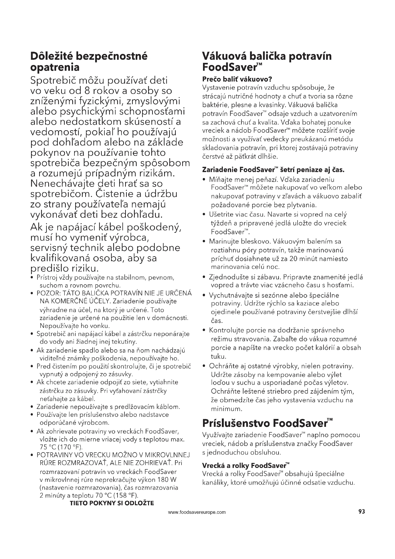 Omotajte kábel okolo úchytiek pod výrobkom. Výrobok možno skladovať vo zvislej polohe podľa znázornenia. Rady a tipy pro skladování Vakuové balení a bezpečnost potravin Procesom vákuového balenia sa predlžuje životnosť potravín prostredníctvom odsatia väčšiny vzduchu zutesnenej nádoby, čím sa znižuje oxidácia, ktorá negatívne vplýva na nutričné hodnoty, chuť acelkovú kvalitu potravín. Odsatím vzduchu sa môže navyše spomaliť tvorba mikroorganizmov, ktoré za určitých podmienok spôsobujú problémy: Ak chcete zachovať bezpečnosť potravín, je dôležité, aby ste ich uskladnili pri nízkych teplotách. Tvorbu mikroorganizmov môžete značne zredukovať pri teplote 4°C alebo nižšej. Zamrazením na teplotu -17°C sa nezabíjajú mikroorganizmy, ale zabráni sa ich šíreniu. Vzáujme dlhodobého uskladnenia vždy zamrazte rýchlo sa kaziace potraviny vo vákuovom balení apo rozmrazení ich skladujte vchladničke. Je dôležité poznamenať, že vákuové balenie NENAHRÁDZA konzervovanie anemôže zabrániť skazeniu potravín. Môže len spomaliť zmeny kvality. Možno len ťažko predpovedať, ako dlho si potraviny udržia prvotriednu chuť, vzhľad alebo textúru, pretože to závisí od čerstvosti astavu potravín vdeň, keď sa vákuovo balili. Dôležité: Vákuové balenie NENAHRÁDZA chladenie ani zmrazenie. Všetky rýchlo sa kaziace potraviny sa musia po vákuovom zabalení skladovať vchladničke alebo mrazničke. Ak chcete predísť možným chorobám, nepoužívajte opakovane vrecká, vktorých bolo uskladnené surové mäso, surové ryby alebo mastné potraviny. Nepoužívajte opakovane vrecká, ktoré boli použité vmikrovlnnej rúre alebo namáčané vmierne vriacej vode. Rozmrazovanie azohrievanie vákuovo balených potravín Potraviny vždy rozmrazujte vchladničke alebo mikrovlnnej rúre. Potraviny podliehajúce skaze nerozmrazujte pri izbovej teplote. Potraviny vo vrecku možno vmikrovlnnej rúre rozmrazovať, ale nie zohrievať. Pri rozmrazovaní potravín vo vreckách FoodSaver