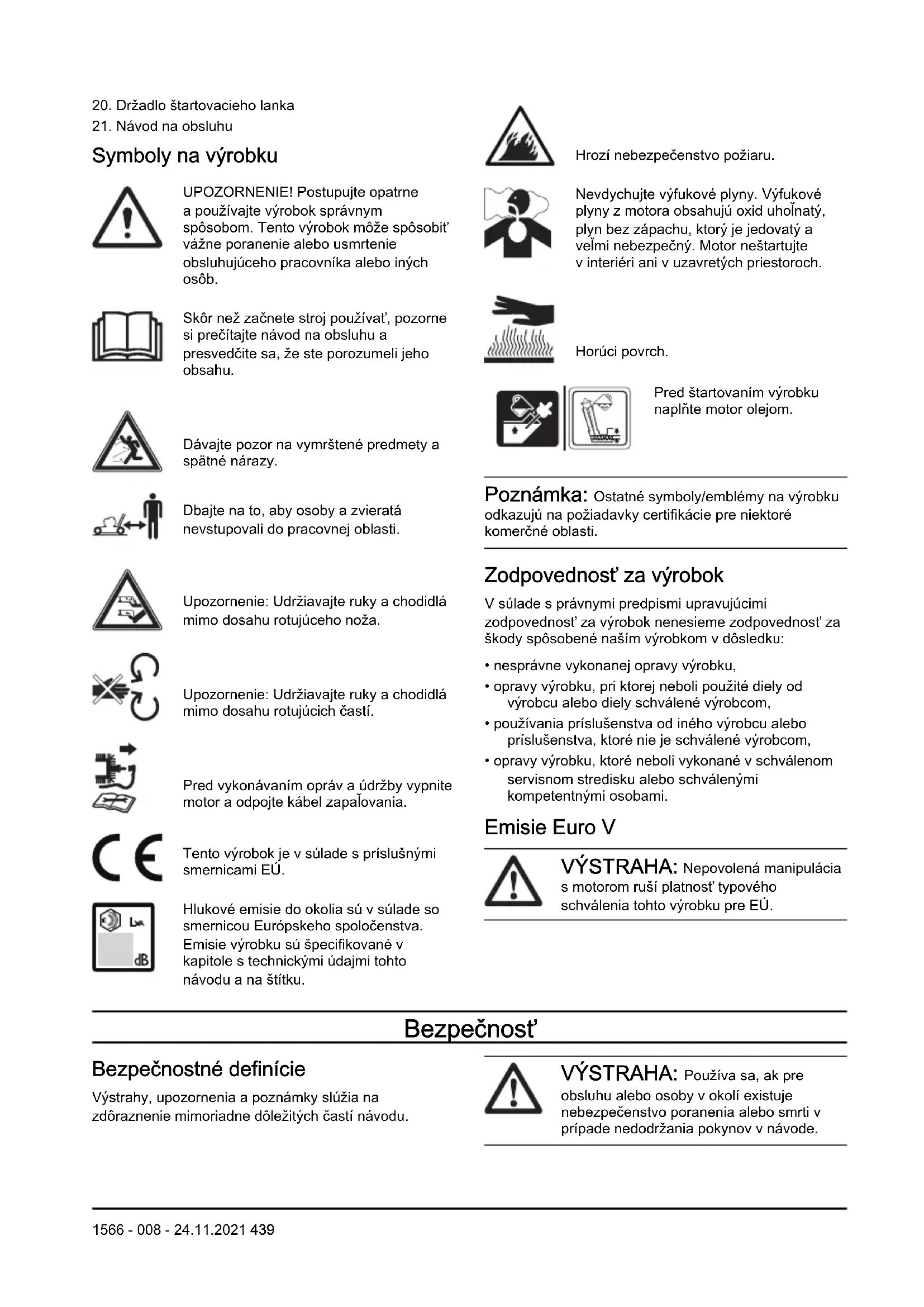 - opravy výrobku, ktoré neboli vykonané v schválenom servisnom stredisku alebo schválenými kompetentnými osobami. Emisie Euro V VÝSTRAHA: Nepovolená manipulácia s motorom ruší platnosť typového schválenia tohto výrobku pre EÚ. Bezpečnosť Bezpečnostné definície Výstrahy, upozornenia a poznámky slúžia na zdôraznenie mimoriadne dôležitých častí návodu. VÝSTRAHA: Používa sa, ak pre obsluhu alebo osoby v okolí existuje nebezpečenstvo poranenia alebo smrti v prípade nedodržania pokynov v návode. 1566 - 008 - 24.11.2021 439VAROVANIE: Používa sa, ak hrozí nebezpečenstvo poškodenia produktu, iných materiálov alebo okolitej oblasti v prípade nedodržania pokynov v návode. Poznámka: Používa sa na poskytnutie informácií nad rámec nevyhnutných informácií v danej situácii. Všeobecné bezpečnostné pokyny VÝSTRAHA: Skôr než budete výrobok používať, prečítajte si nasledujúce výstrahy.