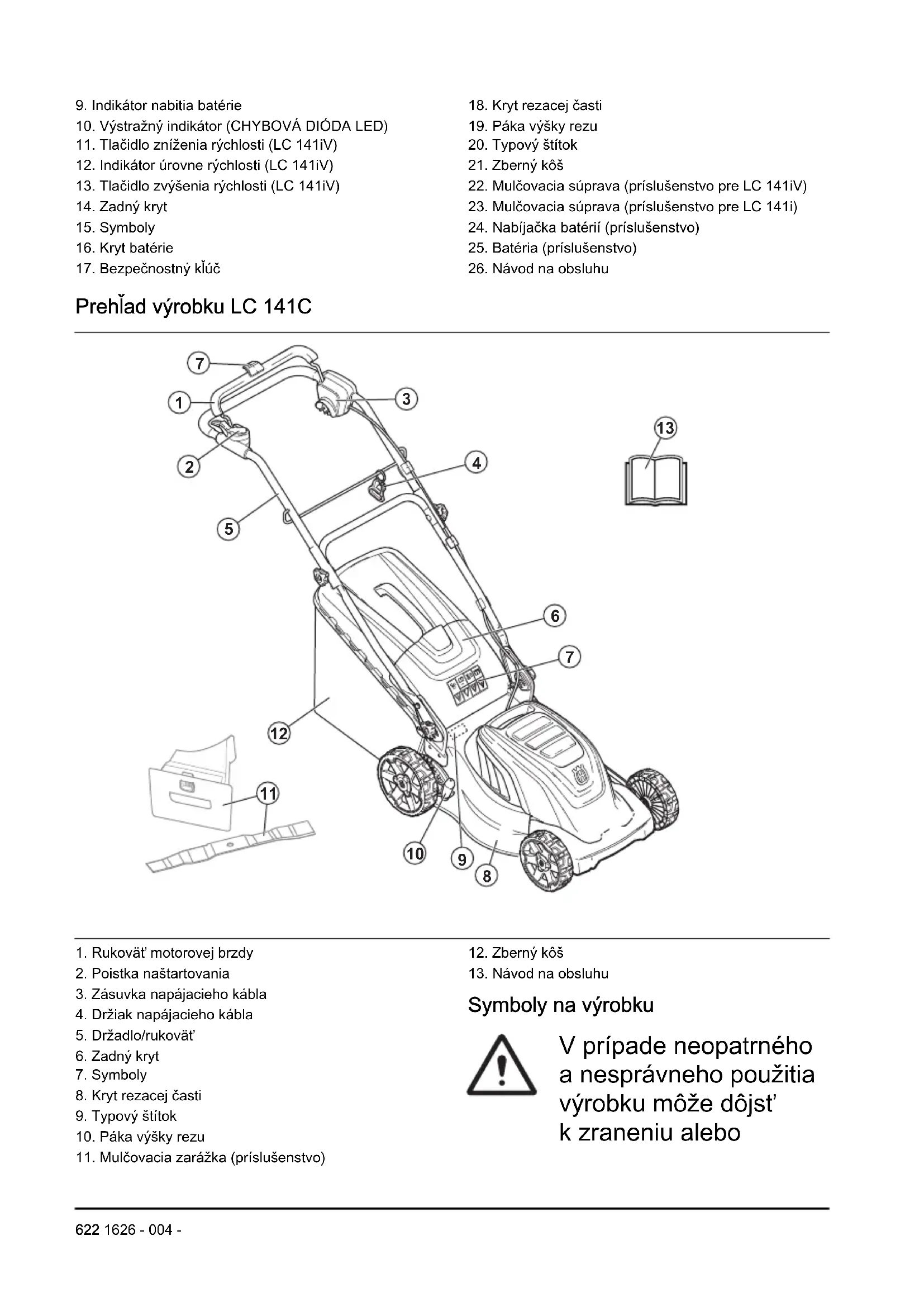 Symboly na výrobku V prípade neopatrného a nesprávneho použitia výrobku môže dôjsť k zraneniu alebo 622 1626 - 004 -usmrteniu obsluhy alebo osôb v okolí. Pred používaním tohto výrobku si prečítajte návod na obsluhu a uistite sa, že porozumiete uvedeným pokynom. Dbajte na to, aby osoby a zvieratá nevstupovali do pracovnej oblasti. Dávajte pozor na vymrštené predmety a spätné nárazy. Upozornenie: Udržiavajte ruky a chodidlá mimo dosahu rotujúceho noža. Upozornenie: Udržiavajte ruky a chodidlá mimo dosahu rotujúcich častí. Pred vykonaním údržby výrobku vytiahnite bezpečnostný kľúč. (model LC 141iV/ LC 141i) Pred vykonávaním údržby odpojte výrobok od elektrickej zásuvky. (model LC 141C) IPX1 – výrobok je vybavený ochranou voči zvisle kvapkajúcej vode (model LC 141iV/ LC 141i) IPX4 – výrobok je vybavený ochranou voči striekajúcej vode (model LC 141C) Dbajte na to, aby výrobok nezmokol na daždi LC 141iV/LC 141i) Upozornenie: S výrobkom neprechádzajte cez napájací kábel, pretože môže dôjsť k úrazu elektrickým prúdom alebo poškodeniu výrobku. (model LC 141C) Tento výrobok je v súlade s príslušnými smernicami ES. Hlukové emisie do okolia sú v súlade so smernicou Európskeho spoločenstva. Emisie výrobku sú špecifikované v kapitole s technickými údajmi tohto návodu a na štítku. 1626 - 004 - 623Jednosmerný prúd. 36V Dvojitá izolácia. Tento výrobok recyklujte v miestnom re- cyklačnom za- riadení urče- nom pre elek- trické a elektro- nické zariade- nia. (Uplatňuje sa iba na Euró- pu) Postup štarto- vania modelu LC 141iV/ LC 141i: stlačte vypínač, uvoľ- nite poistku na- štartovania, po- tlačte rukoväť motorovej brz- dy nadol. Postup štartovania modelu LC 141C: uvoľnite poistku naštartovania, potlačte rukoväť motorovej brzdy nadol. Zastavte uvoľnením rukoväti motorovej brzdy. Pomaly Rýchlo Snímateľný kód Poznámka: Ostatné symboly/emblémy na výrobku odkazujú na zvláštne požiadavky certifikácie pre určité trhy. Zodpovednosť za výrobok V súlade s právnymi predpismi upravujúcimi zodpovednosť za výrobok nenesieme zodpovednosť za škody spôsobené naším výrobkom v dôsledku: