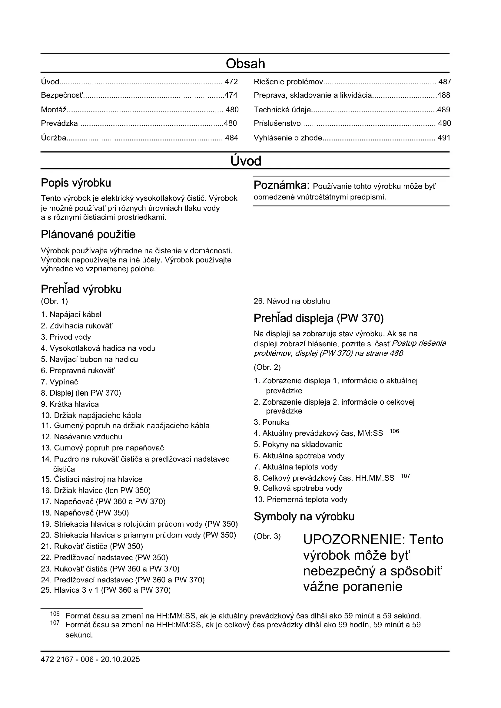Formát času sa zmení na HHH:MM:SS, ak je celkový čas prevádzky dlhší ako 99 hodín, 59 minút a 59 sekúnd. 472 2167 - 006 - 20.10.2025alebo usmrtenie obsluhujúceho pracovníka alebo iných osôb. Postupujte opatrne apoužívajte výrobok správnym spôsobom. (Obr. 4) Pred používaním tohto výrobku si prečítajte návod na obsluhu a uistite sa, že porozumiete uvedeným pokynom. (Obr. 5) Výrobok nie je vhodný na pripojenie krozvodom pitnej vody. (Obr. 6) Vysokotlakové prúdy vody môžu predstavovať nebezpečenstvo vprípade ich nesprávneho použitia. Prúd vody sa nesmie smerovať na osoby, elektrické zariadenia alebo výrobok. (Obr. 7) Označenia týkajúce sa ochrany životného prostredia. Výrobok alebo jeho obal nepredstavuje komunálny odpad. Recyklujte ho vschválenom zariadení na likvidáciu elektrických aelektronických zariadení. (Obr. 8) Nástroj triedy II. (Obr. 9) Označenie týkajúce sa emisie hluku do okolia podľa smerníc anariadení EÚ a UK alegislatívy vštáte New South Wales „Protection of the Environment Operations (Noise Control) Regulations 2017“ (Nariadenia oochrane životného prostredia pri prevádzke (kontrola hluku) zroku 2017). Zaručená hladina akustického výkonu výrobku je uvedená vdokumente Technické údaje na strane 489 ana štítku. (Obr. 10) Chránené proti prúdu vody pod nízkym tlakom zo všetkých uhlov. (Obr. 11) Chráňte pred mrazom. (Obr. 12) Tento výrobok je vsúlade spríslušnými smernicami EÚ. Poznámka: Ostatné symboly/emblémy na výrobku odkazujú na zvláštne požiadavky certifikácie pre určité trhy. 2167 - 006 - 20.10.2025 473Poškodenie výrobku Nie sme zodpovední za škody na našom výrobku v prípade: