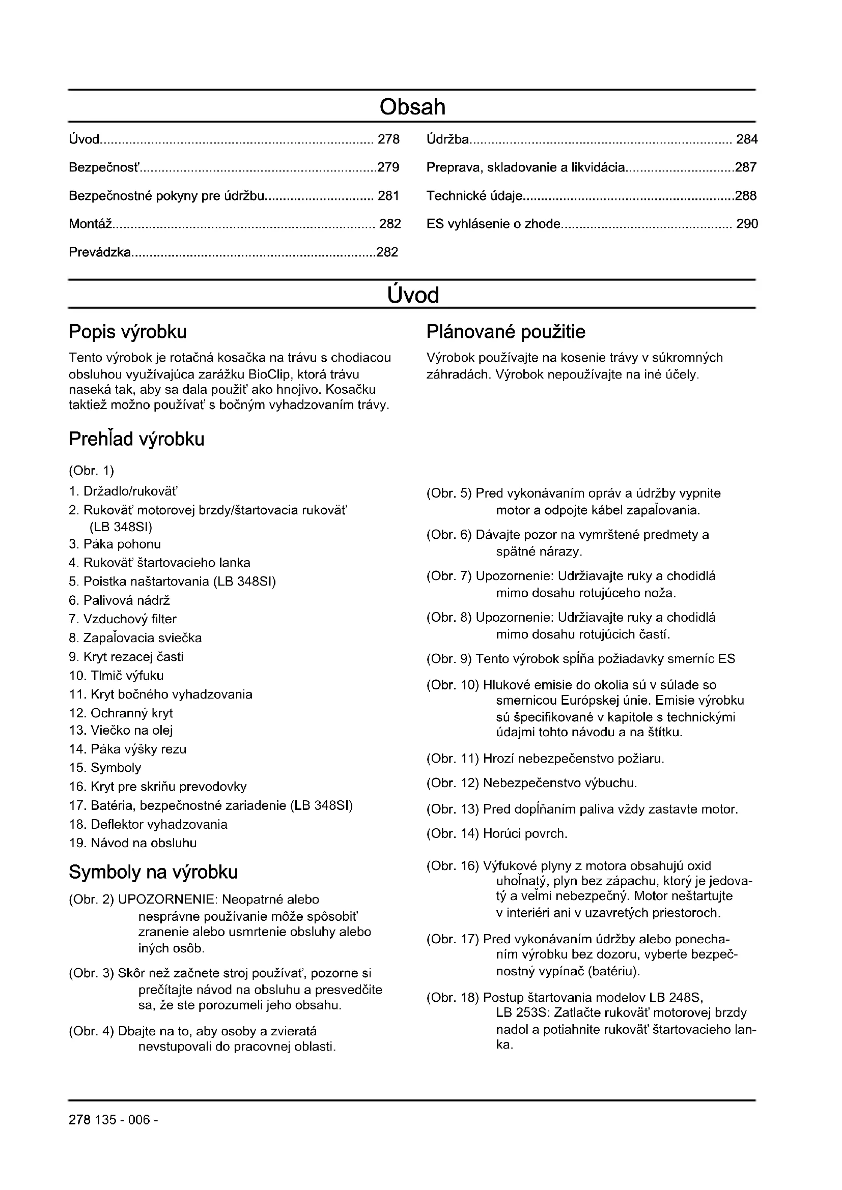 Symboly na výrobku (Obr. 2) UPOZORNENIE: Neopatrné alebo nesprávne používanie môže spôsobiť zranenie alebo usmrtenie obsluhy alebo iných osôb. (Obr. 3) Skôr než začnete stroj používať, pozorne si prečítajte návod na obsluhu a presvedčite sa, že ste porozumeli jeho obsahu. (Obr. 4) Dbajte na to, aby osoby a zvieratá nevstupovali do pracovnej oblasti. (Obr. 5) Pred vykonávaním opráv a údržby vypnite motor a odpojte kábel zapaľovania. (Obr. 6) Dávajte pozor na vymrštené predmety a spätné nárazy. (Obr. 7) Upozornenie: Udržiavajte ruky a chodidlá mimo dosahu rotujúceho noža. (Obr. 8) Upozornenie: Udržiavajte ruky a chodidlá mimo dosahu rotujúcich častí. (Obr. 9) Tento výrobok spĺňa požiadavky smerníc ES (Obr. 10) Hlukové emisie do okolia sú v súlade so smernicou Európskej únie. Emisie výrobku sú špecifikované v kapitole s technickými údajmi tohto návodu a na štítku. (Obr. 11) Hrozí nebezpečenstvo požiaru. (Obr. 12) Nebezpečenstvo výbuchu. (Obr. 13) Pred dopĺňaním paliva vždy zastavte motor. (Obr. 14) Horúci povrch. (Obr. 16) Výfukové plyny z motora obsahujú oxid uhoľnatý, plyn bez zápachu, ktorý je jedova- tý a veľmi nebezpečný. Motor neštartujte v interiéri ani v uzavretých priestoroch. (Obr. 17) Pred vykonávaním údržby alebo ponecha- ním výrobku bez dozoru, vyberte bezpeč- nostný vypínač (batériu). (Obr. 18) Postup štartovania modelov LB 248S, LB 253S: Zatlačte rukoväť motorovej brzdy nadol a potiahnite rukoväť štartovacieho lan- ka. 278 135 - 006 -(Obr. 19) Postup štartovania modelu LB 348SI: Uvoľn- ite poistku naštartovania a zatlačte štartova- ciu rukoväť nadol. (Obr. 15) Snímateľný kód. Poznámka: Ostatné symboly/emblémy na výrobku odkazujú na požiadavky certifikácie pre niektoré komerčné oblasti. Zodpovednosť za výrobok V súlade s právnymi predpismi upravujúcimi zodpovednosť za výrobok nenesieme zodpovednosť za škody spôsobené naším výrobkom v dôsledku: