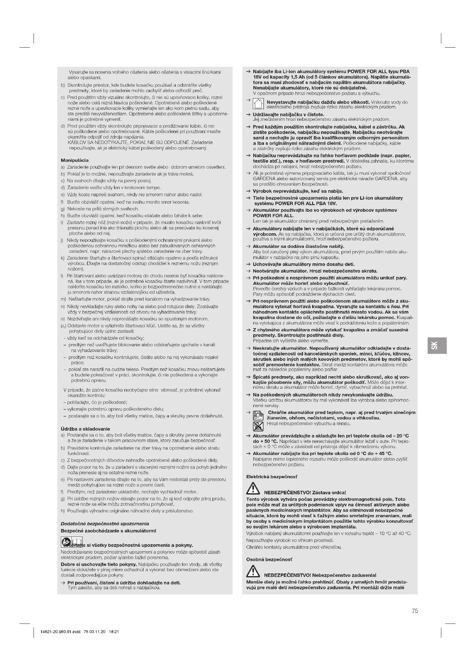 svýrobkom nesmú hrať. Deti nesmú vykonávať čistenie a bežnú údržbu bez dohľadu. Obsluhu tohto výrobku odporúčame zveriť mladistvým až od veku 16 rokov. Určené použitie: Kosačka GARDENA je určená na kosenie trávnikov pri súkromných domoch a v záhradkách. Výrobok nie je určený na dlhodobú prevádzku. NEBEZPEČENSTVO! Ublíženie na zdraví! v Nepoužívajte výrobok na strihanie kríkov, húštin a krovia, nastrihanie popínavých rastlín alebo trávy na strechách a balkónoch, na sekanie konárov a vetiev, ani na vyrovnávanie nerovností pôdy. Nepoužívajte výrobok na svahoch s vyšším stúpaním ako 20°. 14621-20.960.01.indd 74 03.11.20 18:21SK