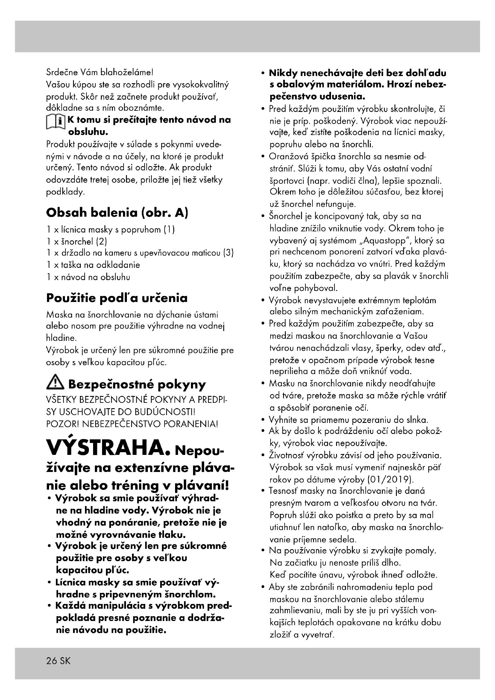 - Pred každým použitím výrobku skontrolujte, či nie je príp. poškodený. Výrobok viac nepouží- vajte, keď zistíte poškodenia na lícnici masky, popruhu alebo na šnorchli.
