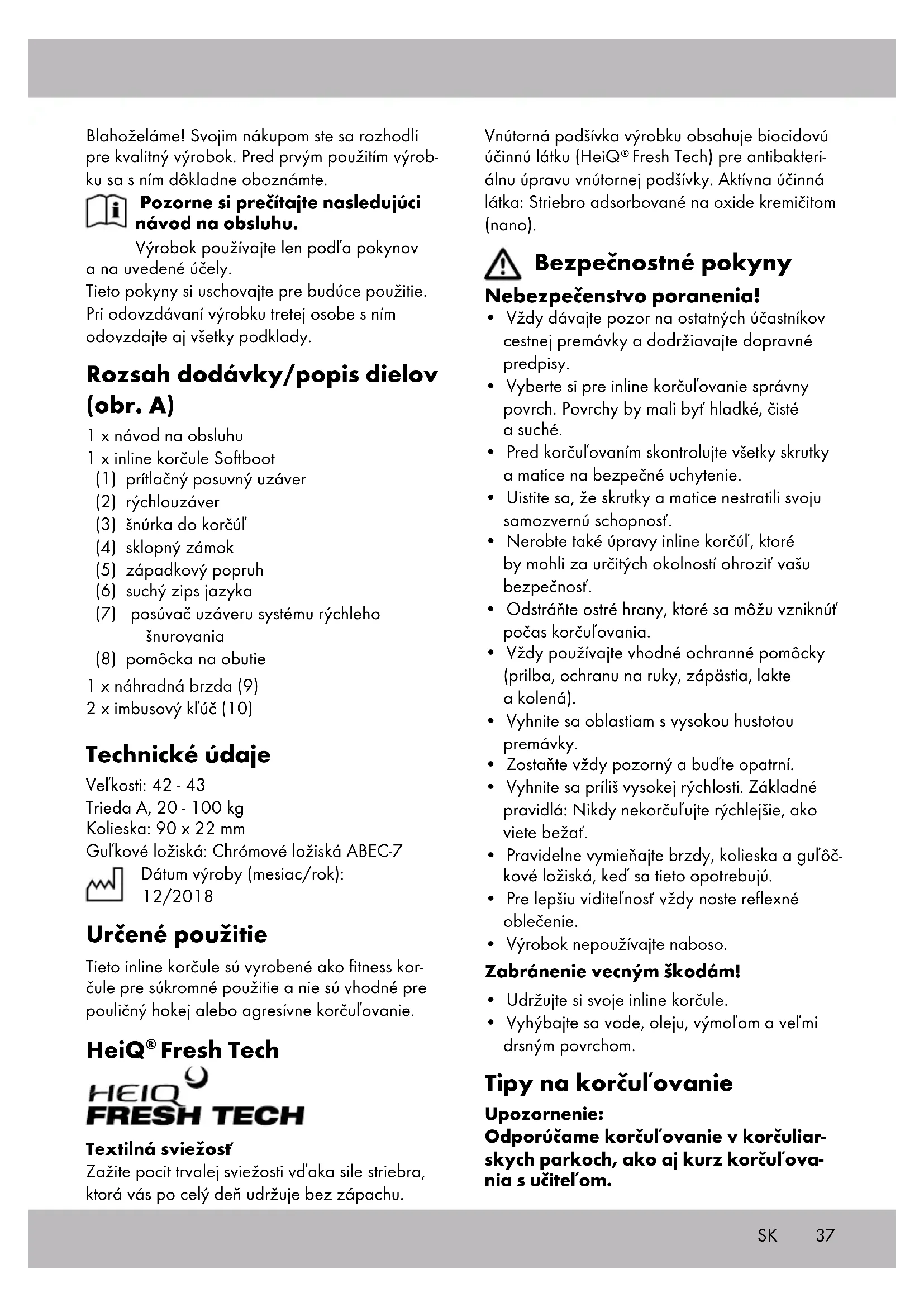 - Vyhýbajte sa vode, oleju, výmoľom a veľmi drsným povrchom. Tipy na korčuľovanie Upozornenie: Odporúčame korčuľovanie v korčuliar- skych parkoch, ako aj kurz korčuľova- nia s učiteľom. Blahoželáme! Svojim nákupom ste sa rozhodli pre kvalitný výrobok. Pred prvým použitím výrob- ku sa s ním dôkladne oboznámte. Pozorne si prečítajte nasledujúci návod na obsluhu. Výrobok používajte len podľa pokynov a na uvedené účely. Tieto pokyny si uschovajte pre budúce použitie. Pri odovzdávaní výrobku tretej osobe s ním odovzdajte aj všetky podklady. Rozsah dodávky/popis dielov (obr. A) 1 x návod na obsluhu 1 x inline korčule Softboot (1) prítlačný posuvný uzáver (2) rýchlouzáver (3) šnúrka do korčúľ (4) sklopný zámok (5) západkový popruh (6) suchý zips jazyka (7) posúvač uzáveru systému rýchleho šnurovania (8) pomôcka na obutie 1 x náhradná brzda (9) 2 x imbusový kľúč (10) Technické údaje Veľkosti: 42 - 43 Trieda A, 20 - 100 kg Kolieska: 90 x 22 mm Guľkové ložiská: Chrómové ložiská ABEC-7 Dátum výroby (mesiac/rok): 12/2018 Určené použitie Tieto inline korčule sú vyrobené ako fitness kor- čule pre súkromné použitie a nie sú vhodné pre pouličný hokej alebo agresívne korčuľovanie. HeiQ