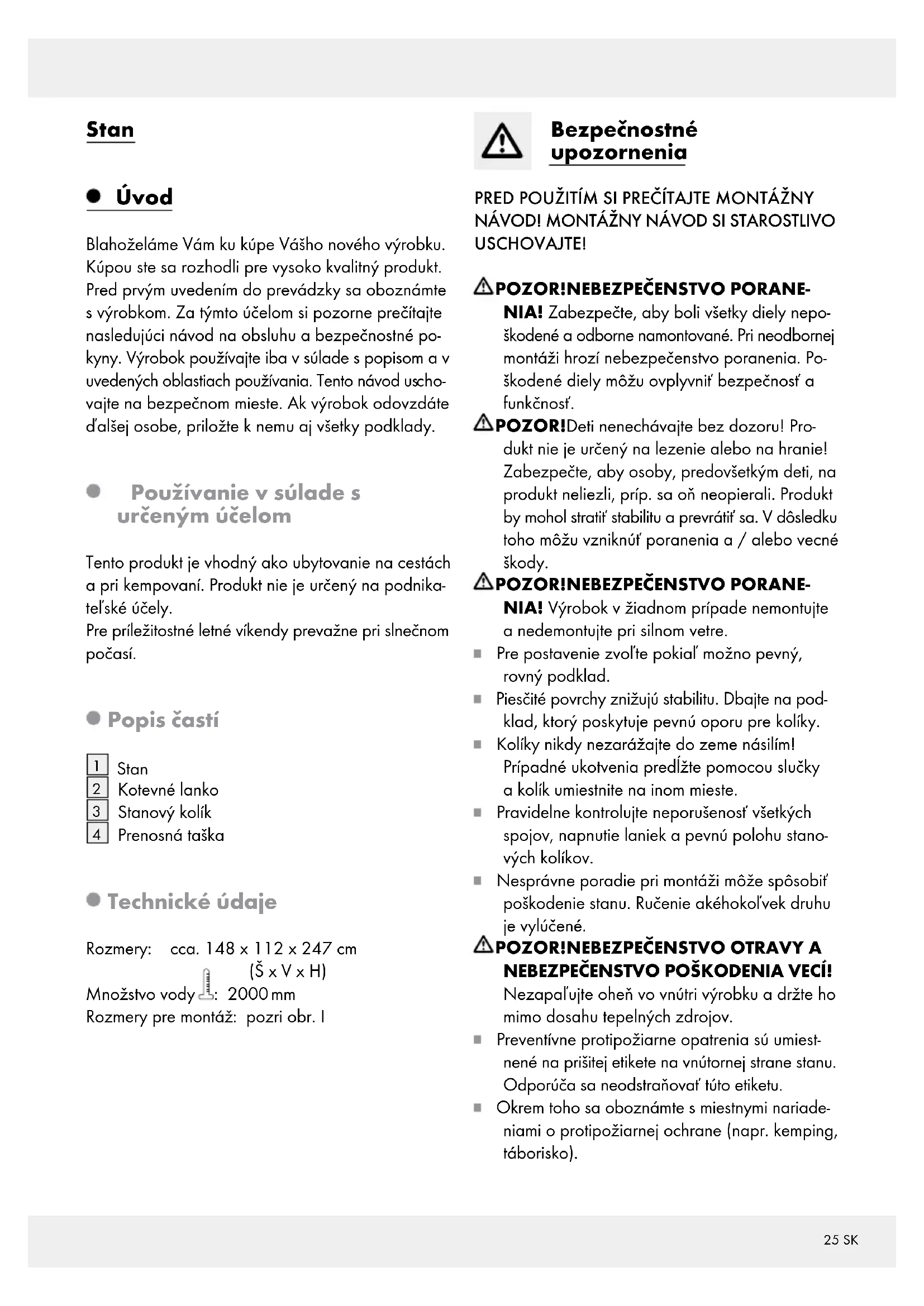 NIA! Výrobok v žiadnom prípade nemontujte a nedemontujte pri silnom vetre. Pre postavenie zvoľte pokiaľ možno pevný, rovný podklad. Piesčité povrchy znižujú stabilitu. Dbajte na pod- klad, ktorý poskytuje pevnú oporu pre kolíky. Kolíky nikdy nezarážajte do zeme násilím! Prípadné ukotvenia predĺžte pomocou slučky a kolík umiestnite na inom mieste. Pravidelne kontrolujte neporušenosť všetkých spojov, napnutie laniek a pevnú polohu stano- vých kolíkov. Nesprávne poradie pri montáži môže spôsobiť poškodenie stanu. Ručenie akéhokoľvek druhu je vylúčené.
