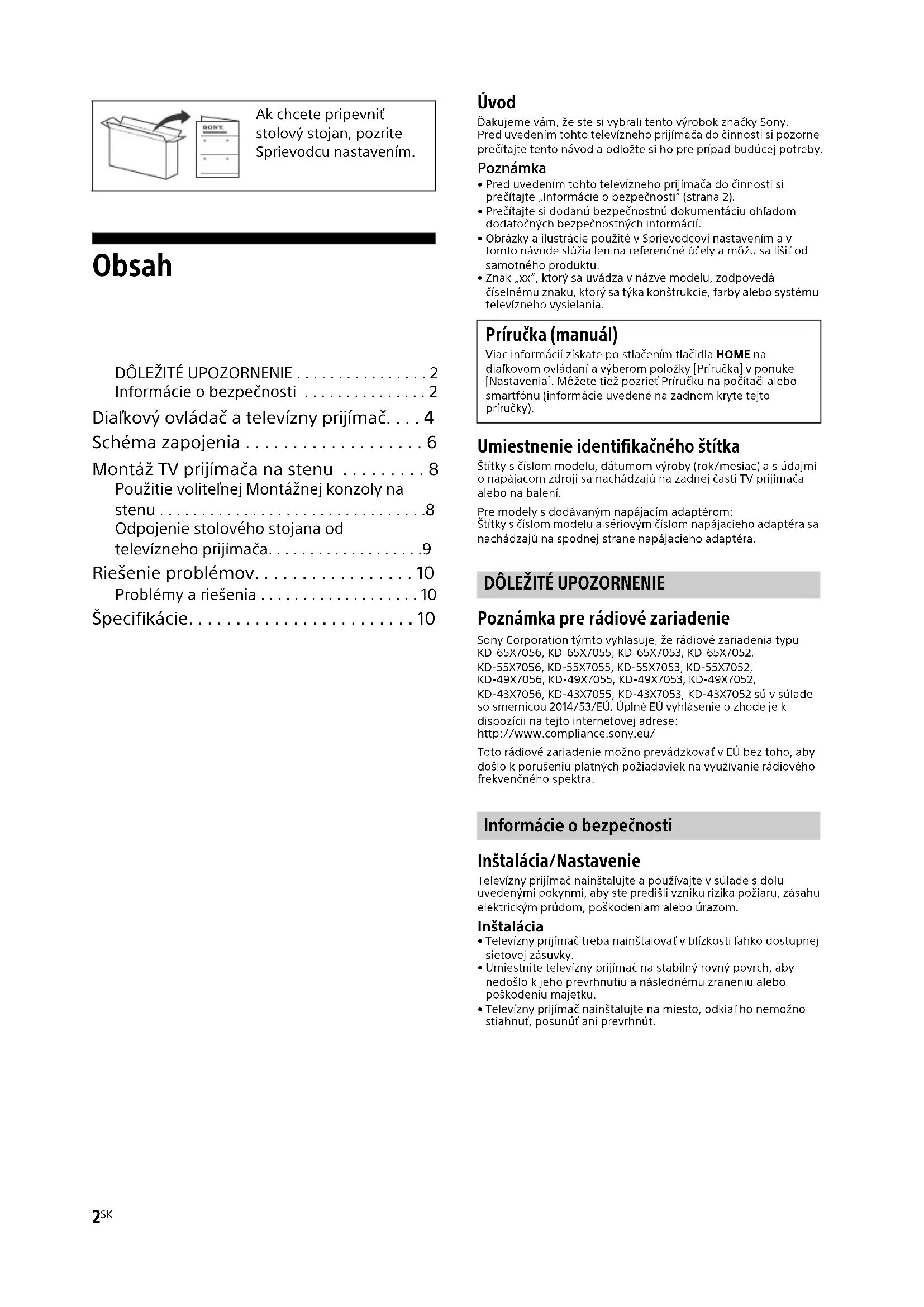 - Pred uvedením tohto televízneho prijímača do činnosti si prečítajte „Informácie o bezpečnosti“ (strana 2).• Prečítajte si dodanú bezpečnostnú dokumentáciu ohľadom dodatočných bezpečnostných informácií.• Obrázky a ilustrácie použité v Sprievodcovi nastavením a v tomto návode slúžia len na referenčné účely a môžu sa líšiť od samotného produktu.• Znak „xx“, ktorý sa uvádza v názve modelu, zodpovedá číselnému znaku, ktorý sa týka konštrukcie, farby alebo systému televízneho vysielania. Umiestnenie identifikačného štítka Štítky s číslom modelu, dátumom výroby (rok/mesiac) a s údajmi o napájacom zdroji sa nachádzajú na zadnej časti TV prijímača alebo na balení.Pre modely s dodávaným napájacím adaptérom:Štítky s číslom modelu a sériovým číslom napájacieho adaptéra sa nachádzajú na spodnej strane napájacieho adaptéra.