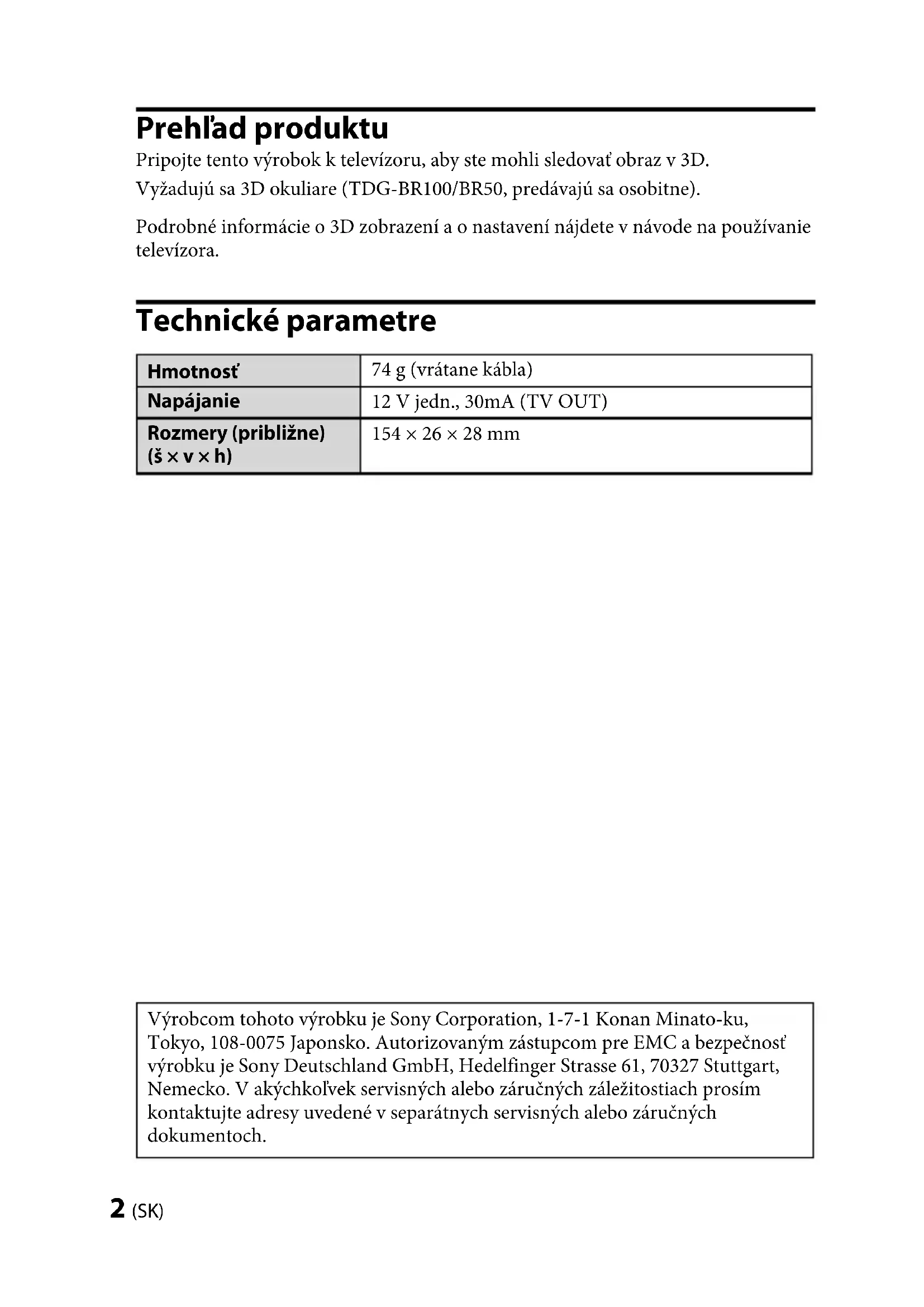 Likvidácia 3D synchronizačného vysielača Likvidácia starých elektrických a elektronických prístrojov (vzťahuje sa na Európsku úniu a európske krajiny so systémami oddeleného zberu) Tento symbol na výrobku alebo na jeho obale znamená, že výrobok nesmie byť spracovávaný ako komunálny odpad. Musí sa odovzdať do príslušnej zberne na recykláciu elektrických a elektronických zariadení. Zaručením správnej likvidácie tohto výrobku pomôžete pri predchádzaní potenciálnych negatívnych dopadov na životné prostredie a na zdravie človeka, ktoré by mohli byť zapríčinené nevhodným zaobchádzaním s odpadmi z tohto výrobku. Recyklovaním materiálov pomôžete zachovať prírodné zdroje. Podrobnejšie informácie o recyklácii tohto výrobku vám na požiadanie poskytne miestny úrad, služba likvidácie komunálneho odpadu alebo predajňa, v ktorej ste si tento výrobok zakúpili.TMR-BR100 4-180-471-26(1) 4 (SK) TMR-BR100 4-180-471-26(1) Upozornenie Prečítajte si tieto bezpečnostné pokyny v záujme zaručenia osobnej bezpečnosti a predchádzania škodám na majetku. Upozornenia pri používaní 3D okuliare prijímajú infračervené lúče z 3D Synchronizačného vysielača. Ak sa v blízkosti nachádzajú iné komunikačné zariadenia, svietidlá alebo bytové vykurovacie telesá využívajúce infračervené žiarenie a pod., môže to negatívne ovplyvniť funkčnosť okuliarov. Pri sledovaní videozáznamov vo formáte 3D dbajte na to, aby ste záznam sledovali v stanovenom dosahu signálu. (Pozrite obrázok „Komunikačný dosah 3D Synchronizačného vysielača a 3D okuliarov.“) Ak 3D okuliare používate mimo stanoveného dosahu, nemusí byť možné sledovať videozáznamy vo formáte 3D. Signál 3D Synchronizačného vysielača môže spôsobovať rušenie funkcie diaľkového ovládača využívajúceho infračervené žiarenie. V takom prípade zmeňte nasmerovanie 3D Synchronizačného vysielača. Bezpečnostné upozornenia Tento výrobok používajte iba na sledovanie 3D obrazu na kompatibilnom TV prijímači Sony. Pri používaní tohto výrobku sa u niektorých ľudí môžu vyskytnúť určité ťažkosti (napríklad namáhanie očí, únava alebo nevoľnosť). Sony odporúča všetkým divákom, aby si pri sledovaní 3D obrazu alebo hraní stereoskopických 3D hier dopriali pravidelné prestávky. Dĺžka a frekvencia potrebných prestávok sa líši od osoby k osobe. Vy sami musíte rozhodnúť, čo vám najviac vyhovuje. V prípade, že sa u vás prejavia akékoľvek ťažkosti, mali by ste prestať používať tento výrobok a prestať sledovať 3D obraz, kým ťažkosti nepominú. V prípade potreby sa poraďte s lekárom. Prečítajte si aj (i) príručku k televíznemu prijímaču a ostatným zariadeniam či médiám, ktoré spolu s ním používate a (ii) našu webovú stránku (http://www.sony-europe.com/myproduct), kde nájdete najnovšie informácie. Zrak malých detí (najmä do veku šesť rokov) sa stále vyvíja. Predtým ako povolíte malým deťom sledovať 3D obraz alebo hrať stereoskopické 3D hry sa poraďte s lekárom (napr. detským alebo očným lekárom). Dospelí by mali dozerať na malé deti, či dodržiavajú vyššie uvedené odporúčania. Dávajte pozor, aby vám zariadenie nespadlo. Zariadenie neupravujte.